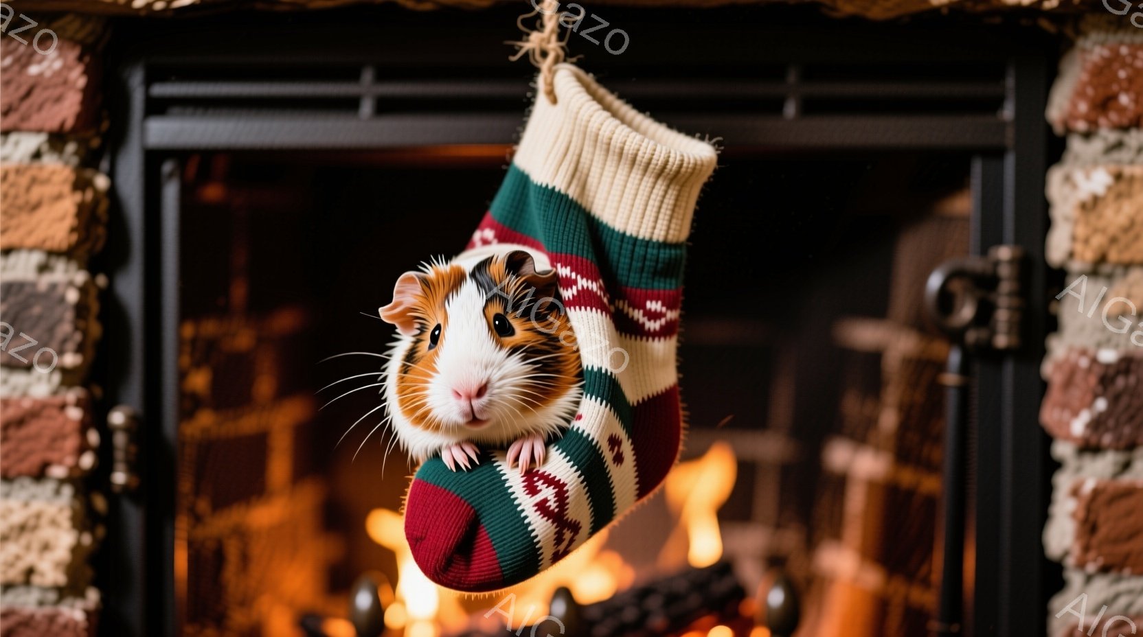小さなハムスターが、赤と白の模様が入った編み物の手袋の中に座っています。ハムスターは少し緊張した表情でカメラを見つめており、手袋から小さな前足を伸ばしています。背景には暖炉があり、燃え盛る炎とレンガ造りの壁が温かい雰囲気を作り出しています。