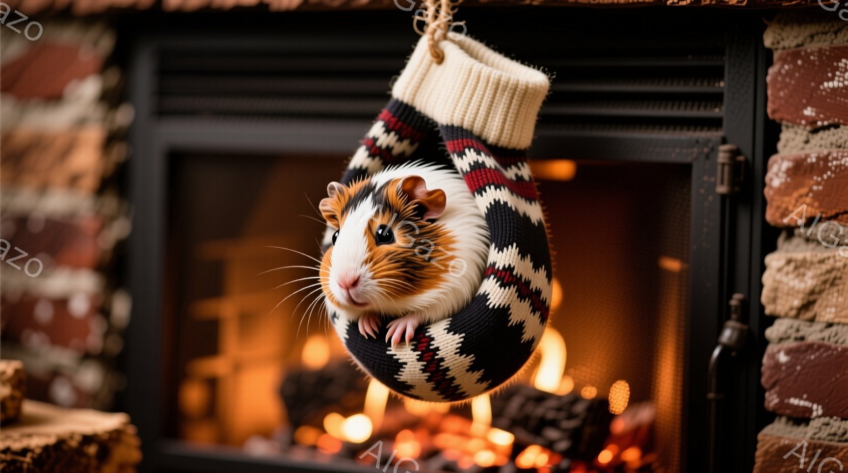 ハムスターが編み物の靴下の中に可愛らしく収まっており、小さな前足で靴下の縁をつかんでいます。背景には暖炉のレンガと燃え盛る炎があり、温かく居心地の良い雰囲気を作り出しています。ハムスターの表情は好奇心旺盛で、まるで何か面白いものを発見したかのようです。