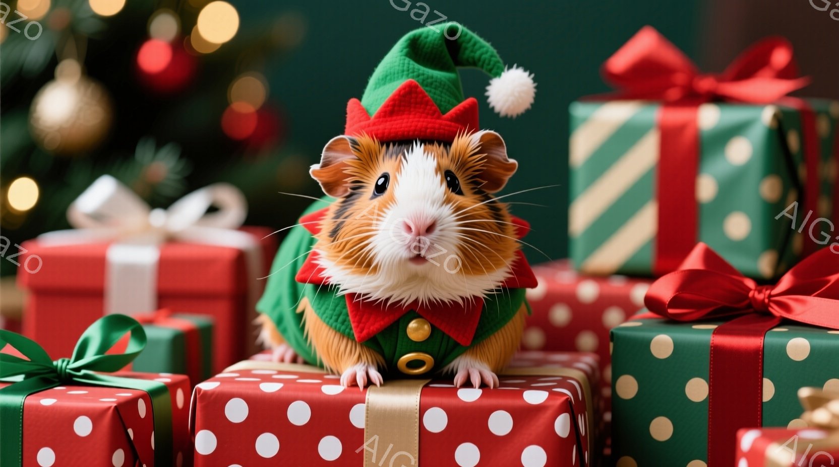 白茶色のモルモットがクリスマスエルフの衣装を着て、プレゼントの箱の上に立っています。エルフの帽子は赤と緑で、首には赤いリボンが付いています。背景には緑色のドット柄のプレゼントの箱が積み重なり、クリスマスの飾り付けがぼやけて見え、温かく楽しい雰囲気を醸し出しています。