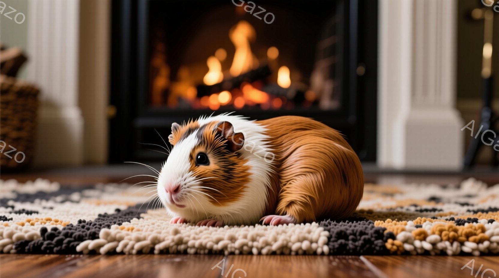 白と茶色の毛並みのモルモットが、カラフルな敷物の上に座っています。背景には暖炉があり、炎が燃え盛っています。暖かく心地よい雰囲気で、モルモットはリラックスした様子で、部屋全体が安らぎに満ちています。