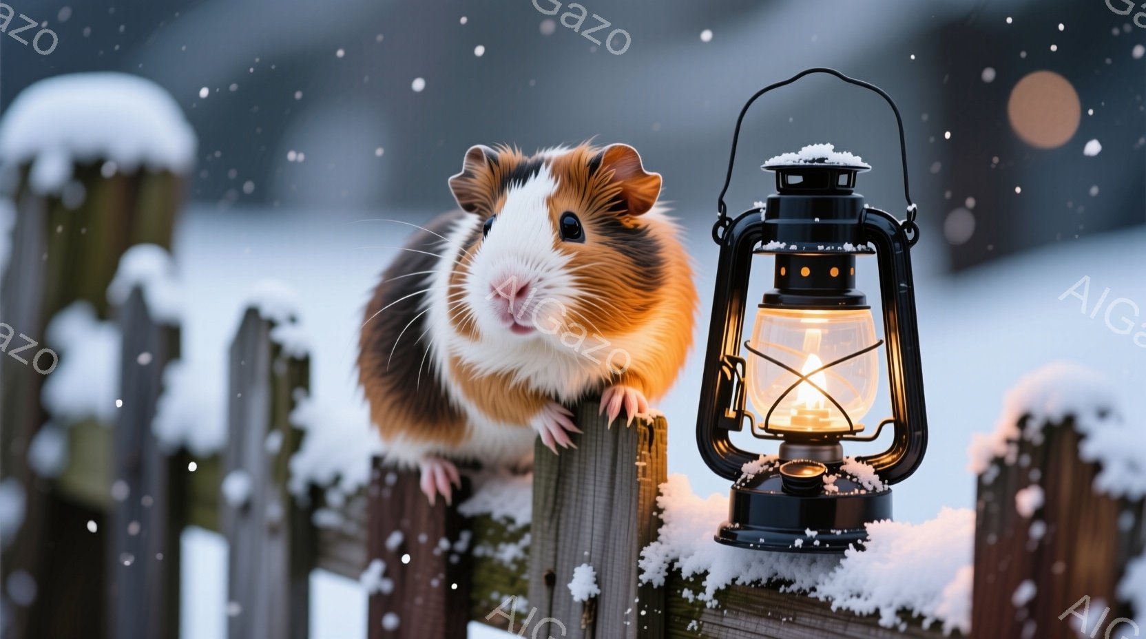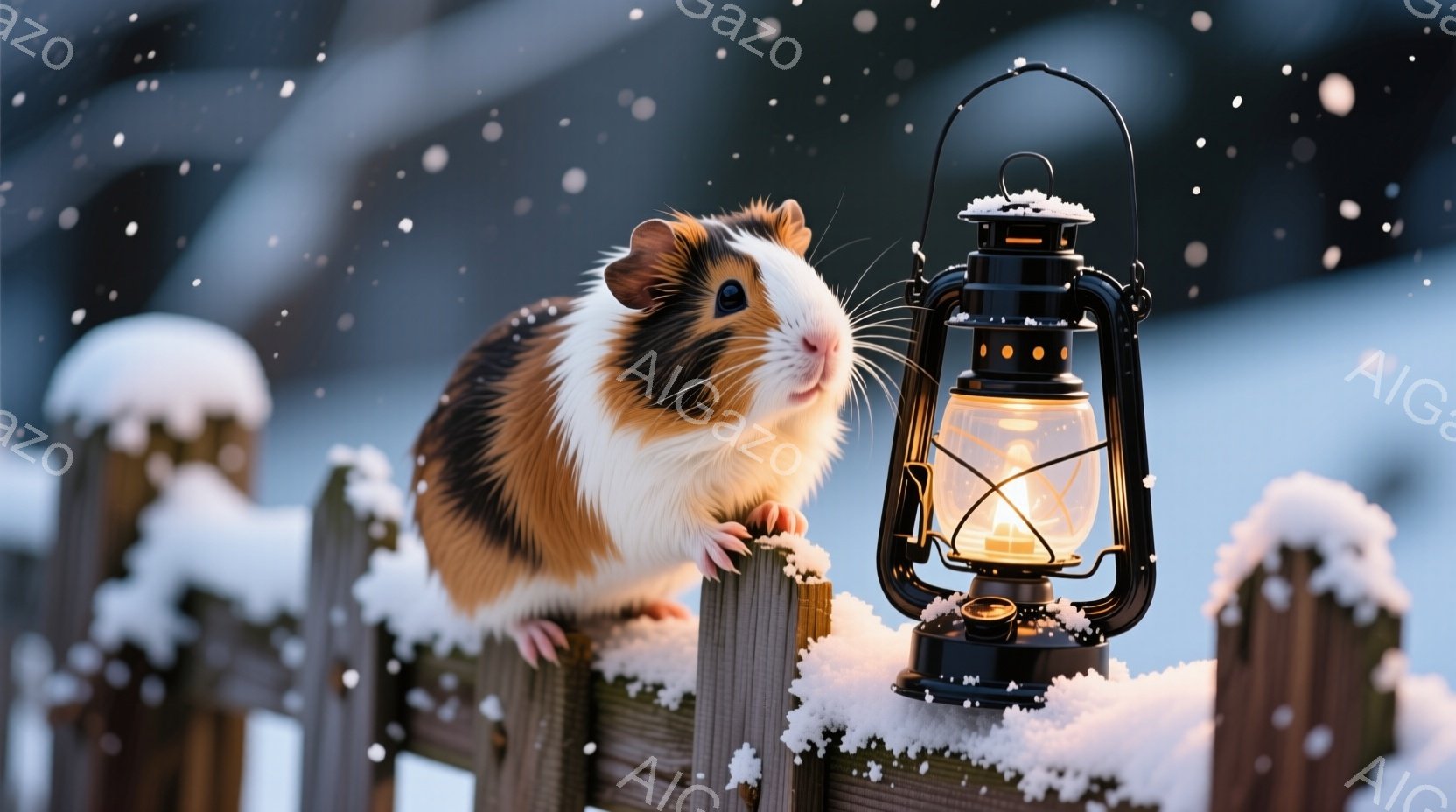 雪が舞う冬の風景の中に、可愛らしいモルモットが木の柵にちょこんと座っています。モルモットは白と茶色の毛並みで、好奇心いっぱいの表情で正面を見ています。背景には点灯したランタンがあり、幻想的な雰囲気を醸し出しています。