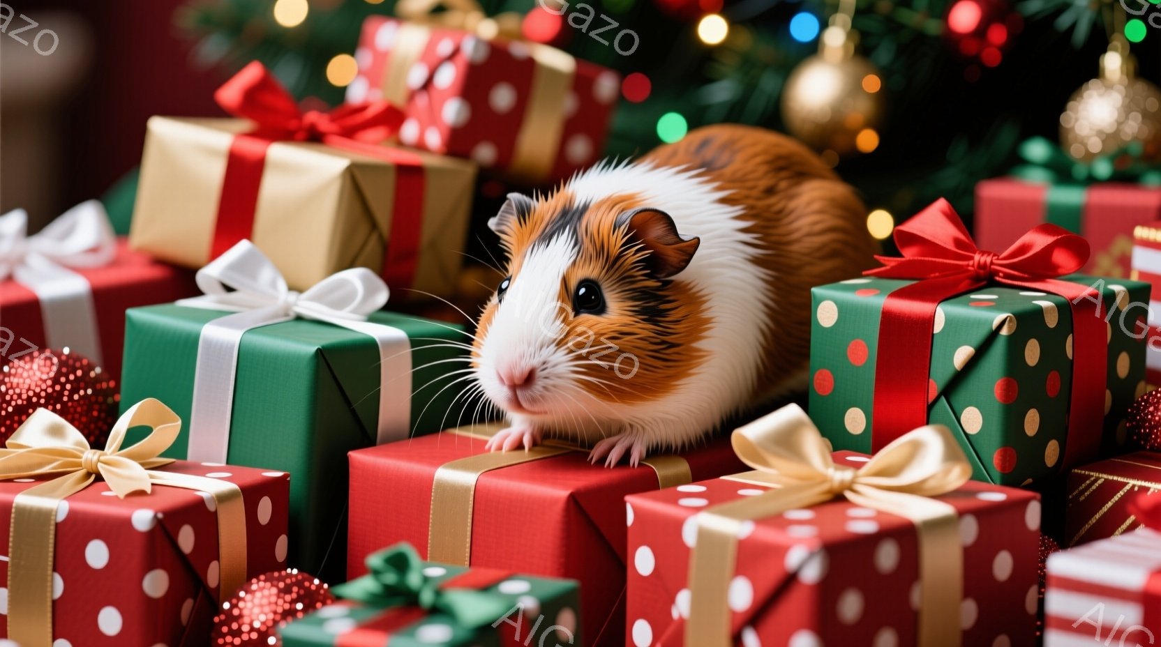 モルモットがクリスマスプレゼントの山の上に座ってこちらを見ています。プレゼントは赤や緑で、金色のリボンと装飾が施されています。背景にはぼやけたクリスマスツリーと、雪のような装飾が散りばめられており、暖かいお祝いの雰囲気が漂っています。