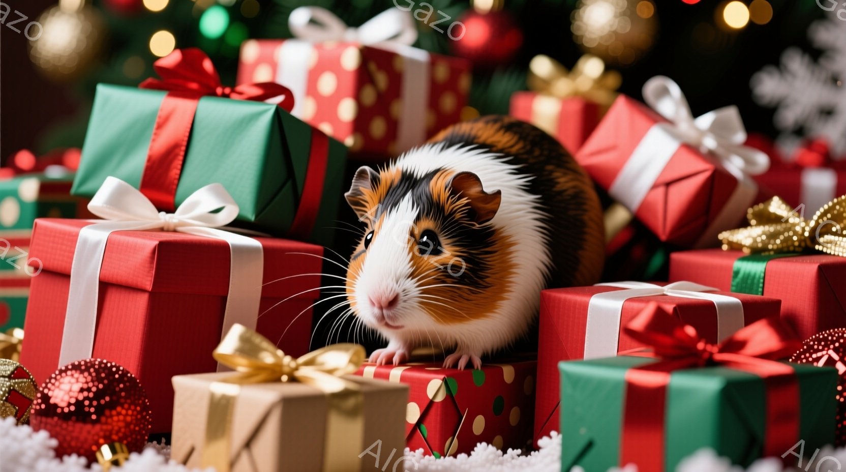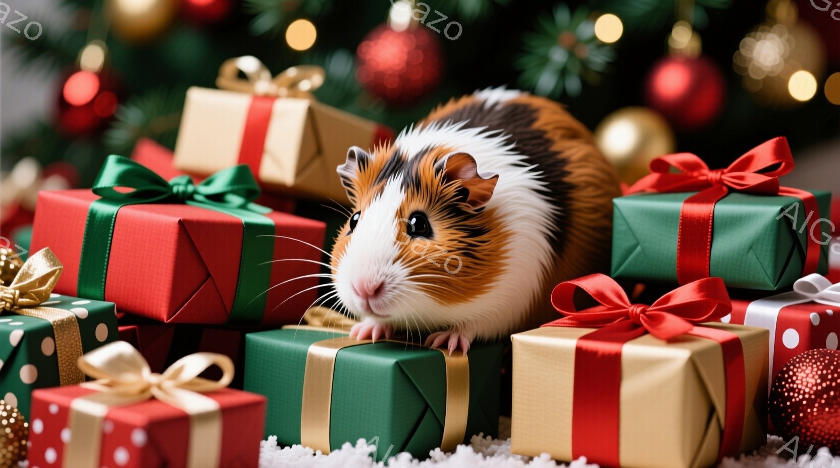 複数のプレゼントボックスに囲まれたモルモットが正面を見つめています。プレゼントは緑、赤、白を基調とし、金色のリボンや水玉模様が施されており、クリスマスや誕生日を連想させます。背景はぼやけており、クリスマスツリーの光がわずかに見え、暖かくお祝いムードを醸し出しています。