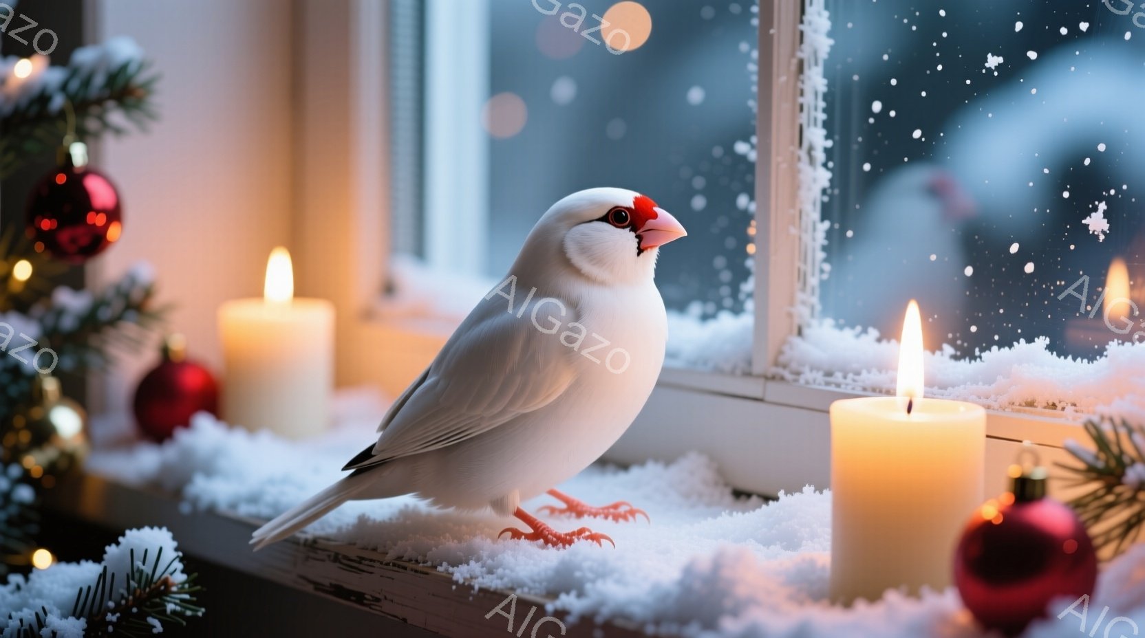 この無料AI生成画像「明るい黄色の鳥が、赤いリボンと金色のオーナメントで飾られた枝に止まっています。鳥は正面を向き、少し上を見つめているように見え、その鮮やかな色彩が印象的です。背景は深緑色で、キラキラと輝くオーナメントが鳥を引き立て、暖かく華やかなクリスマスの雰囲気を醸し出しています。」は、2025年10月25日に作成されました。 サイズは 1664×928px の高解像度で、商用利用も可能なフリー素材として提供しています。
