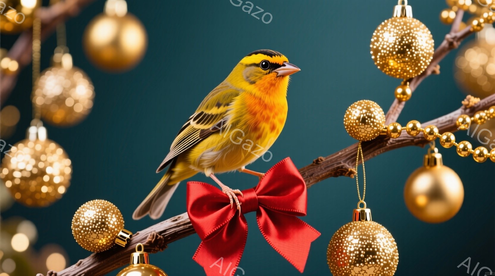 明るい黄色の鳥が、赤いリボンと金色のオーナメントで飾られた枝に止まっています。鳥は正面を向き、少し上を見つめているように見え、その鮮やかな色彩が印象的です。背景は深緑色で、キラキラと輝くオーナメントが鳥を引き立て、暖かく華やかなクリスマスの雰囲気を醸し出しています。