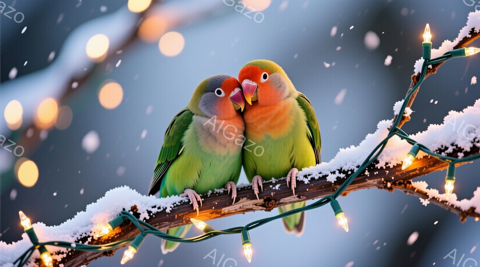 雪が降る中で、二羽の愛情豊かな緑色のオカメインコが、雪で覆われた枝に寄り添っています。彼らは互いに顔を寄せ合い、優しい表情で暖を取り合っているように見えます。背景にはぼやけた光のストリングが輝き、ロマンチックで冬らしい雰囲気を醸し出しています。