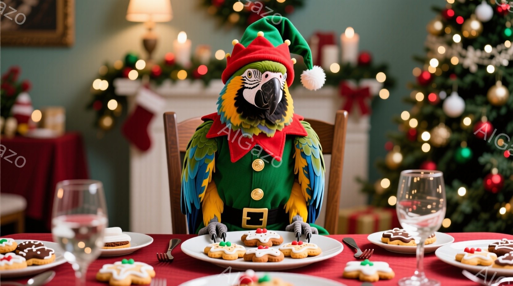 クリスマスをテーマにした写真には、緑色のエルフの衣装を着たオウムが写っています。オウムはテーブルに座り、前に置かれたクッキーの皿を見つめています。背景にはクリスマスツリーが飾られ、温かく、お祝いの雰囲気が漂っています。