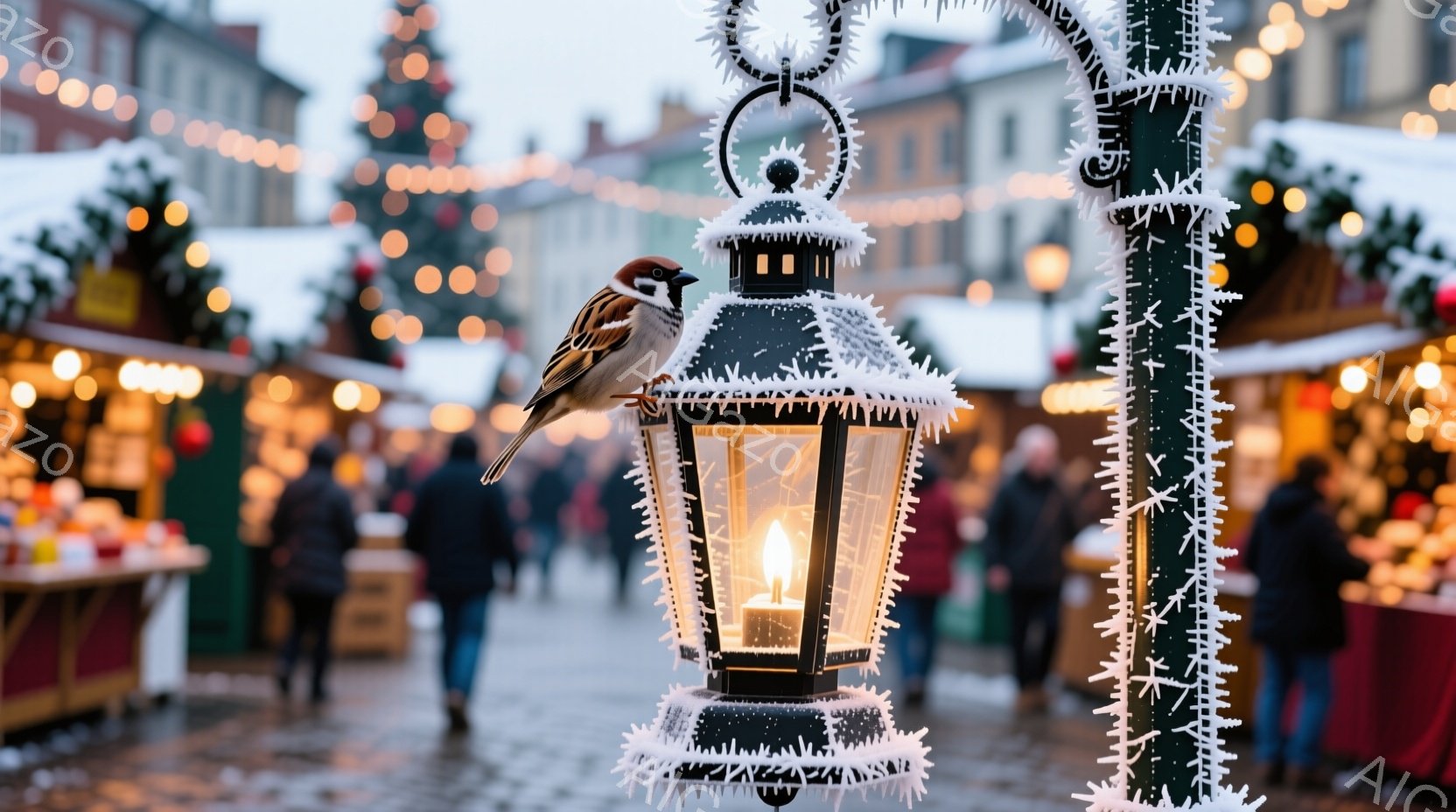 石畳の道に沿ってクリスマスの装飾が施されたランタンが立ち並び、その一つに雀が止まっています。背景には、クリスマスマーケットの屋台が並び、人々の姿も見え、賑やかな雰囲気が感じられます。全体的に温かい光と装飾が、冬の祝祭の喜びと静けさを表現しています。