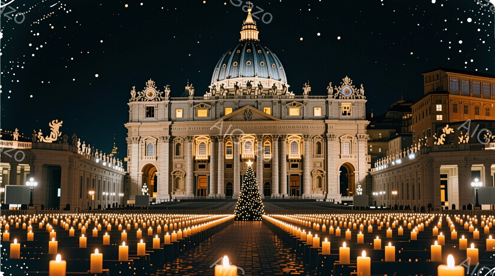 バチカン市の聖ペトロ大聖堂が夜にライトアップされ、正面には多くのロウソクが並べられています。中央にはクリスマスツリーが飾られ、荘厳で神聖な雰囲気を醸し出しています。背景は暗く、ロウソクの温かい光が、大聖堂の壮麗な建築と対照的になっています。