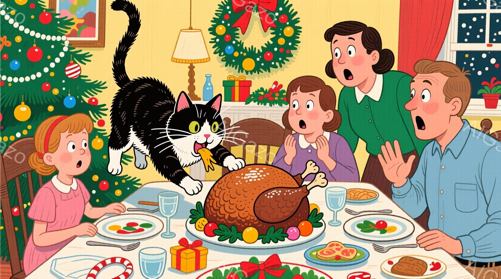 クリスマスツリーと飾り付けられた食卓を背景に、オレンジ色の毛並みの猫が、食卓の真ん中に置かれたローストターキーに飛びかかろうとしている場面です。少女は赤い髪をリボンでまとめ、驚いた表情で猫を見つめ、男性と女性は大きく目を開けて驚き、手を広げています。暖炉と雪景色が見える窓があり、全体的に賑やかでコミカルなクリスマスの雰囲気を伝えています。