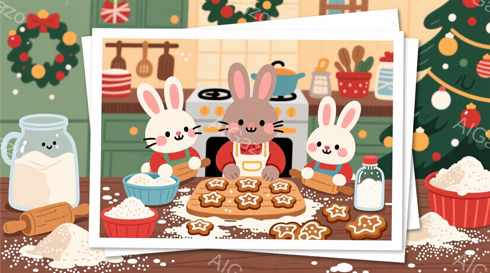 白いウサギがエプロンをつけて、クリスマスツリーの近くのキッチンでクッキーを作っています。ウサギは前かがみになり、クッキー生地を転がし、星やハートなどの様々な形に切り抜いています。背景には、プレゼントやクリスマスデコレーション、オーブンやジャムの瓶が置かれた、温かく居心地の良いキッチンがあり、クリスマスの楽しい雰囲気を醸し出しています。