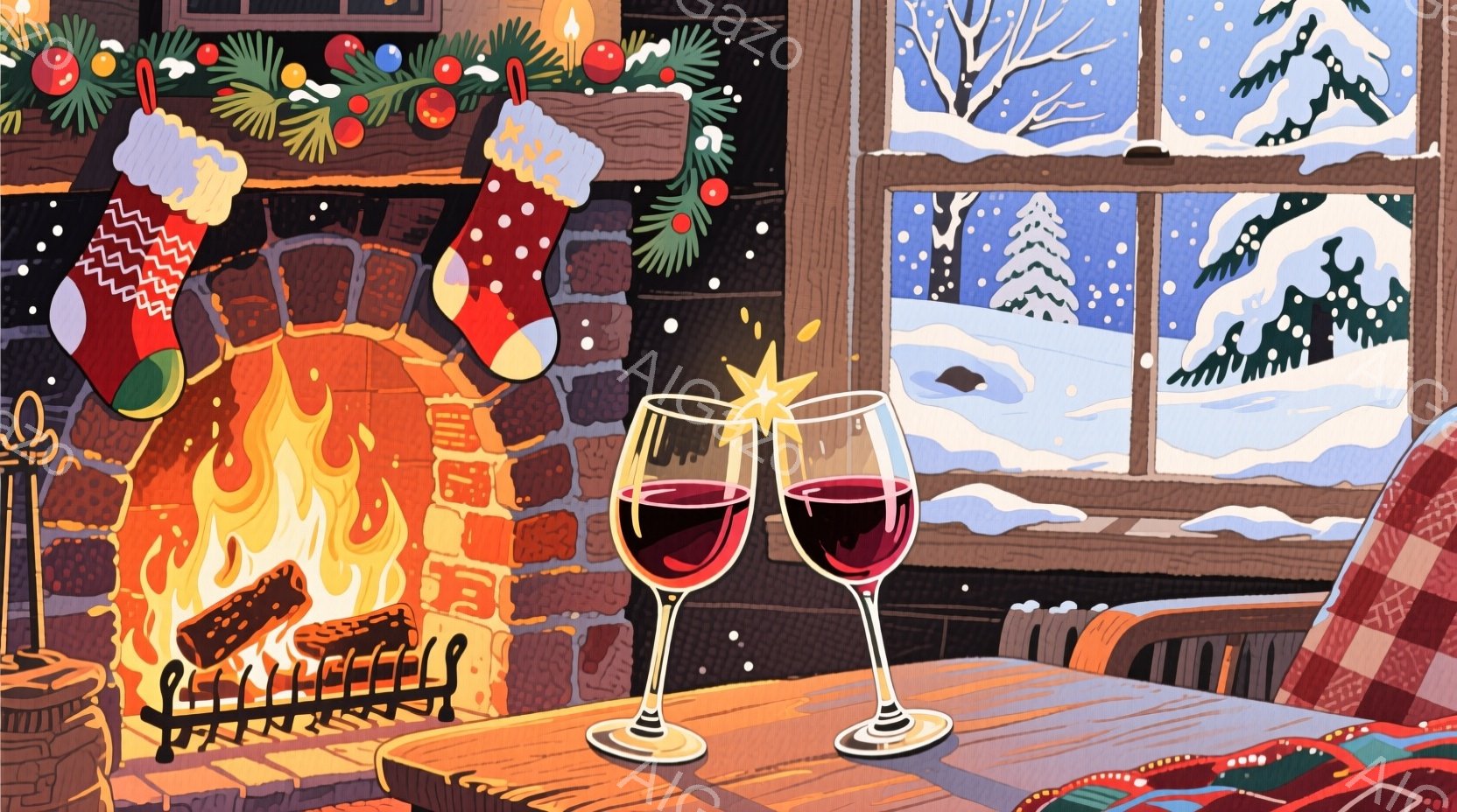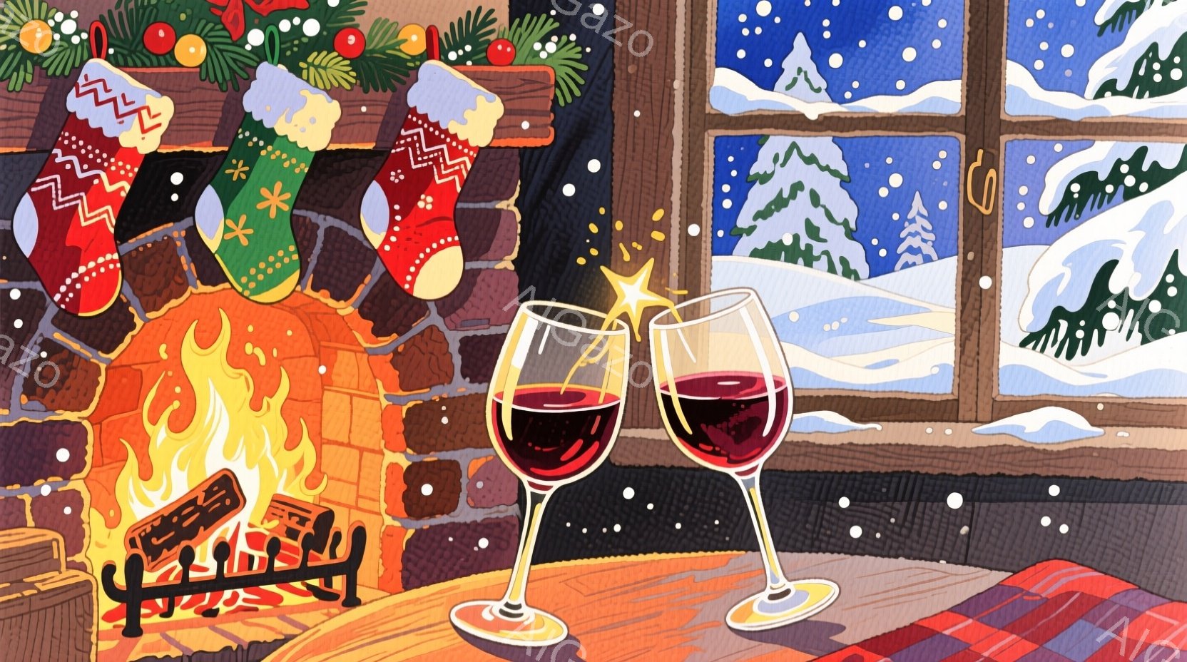 壁炉の前に置かれた2つのワイングラスが目に入ります。暖炉では木々が燃え盛り、クリスマスの装飾が施されたマントルピースには、靴下やクリスマスオーナメントが飾られています。窓の外には雪景色が広がり、暖かい室内とのコントラストが冬の穏やかな雰囲気を醸し出しています。