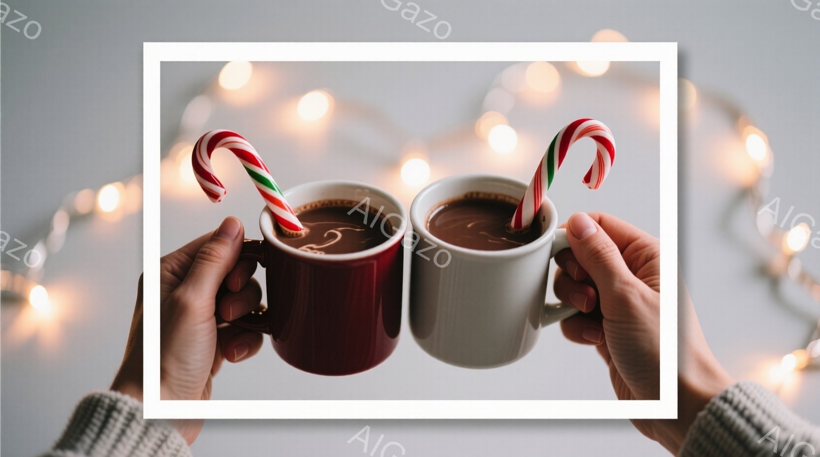 互いに向かい合った二つのマグカップが描かれており、それぞれ濃い緑色と白色をしています。それぞれのカップにはキャンディケーンが差し込まれており、温かい飲み物が中に入っているようです。背景にはぼやけた光のストリングが散りばめられており、温かく心地よい雰囲気を醸し出しています。