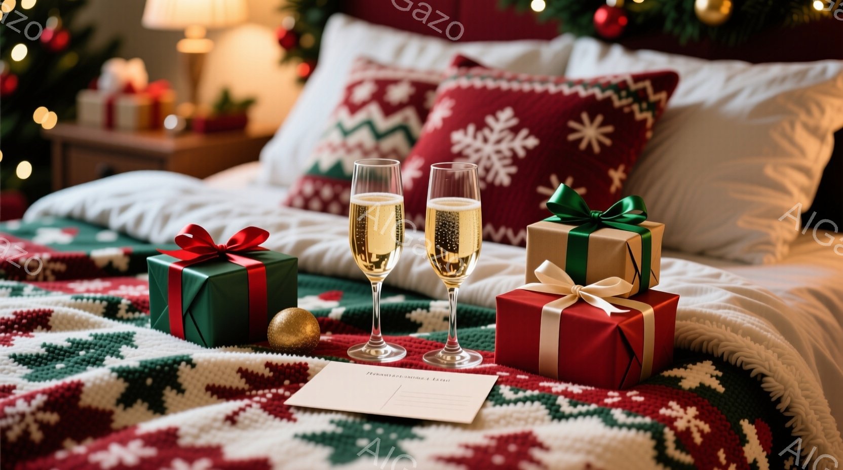 クリスマスを祝う温かい光景が描かれています。ベッドの上にシャンパンのボトルとグラス、そしてプレゼントが置かれており、赤い、緑、白のクリスマスのニットブランケットが暖かさを添えています。背景にはぼやけたクリスマスツリーが見え、ホリデーシーズンの穏やかでロマンチックな雰囲気を醸し出しています。