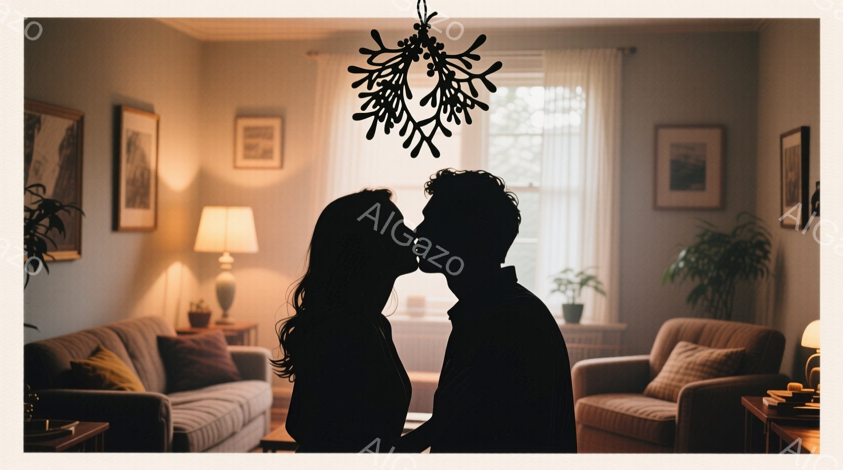 シロウトのシルエットで描かれたカップルが、ミステリーの枝の下でキスをしようとしています。 彼らはカジュアルな服装で、暖かく親密なリビングルームに立っています。 背景には、ソファ、ランプ、植物が見え、全体的にロマンチックで心地よい雰囲気です。