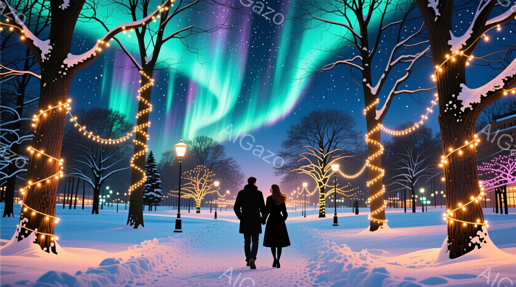 雪に覆われた公園を、コートを着た男女が並んで歩いている。女性は長く茶色の髪をしており、男性は黒いコートを着ている。背景には木々が立ち並び、空にはオーロラのような美しい光が輝き、幻想的な冬の夜の雰囲気を醸し出している。
