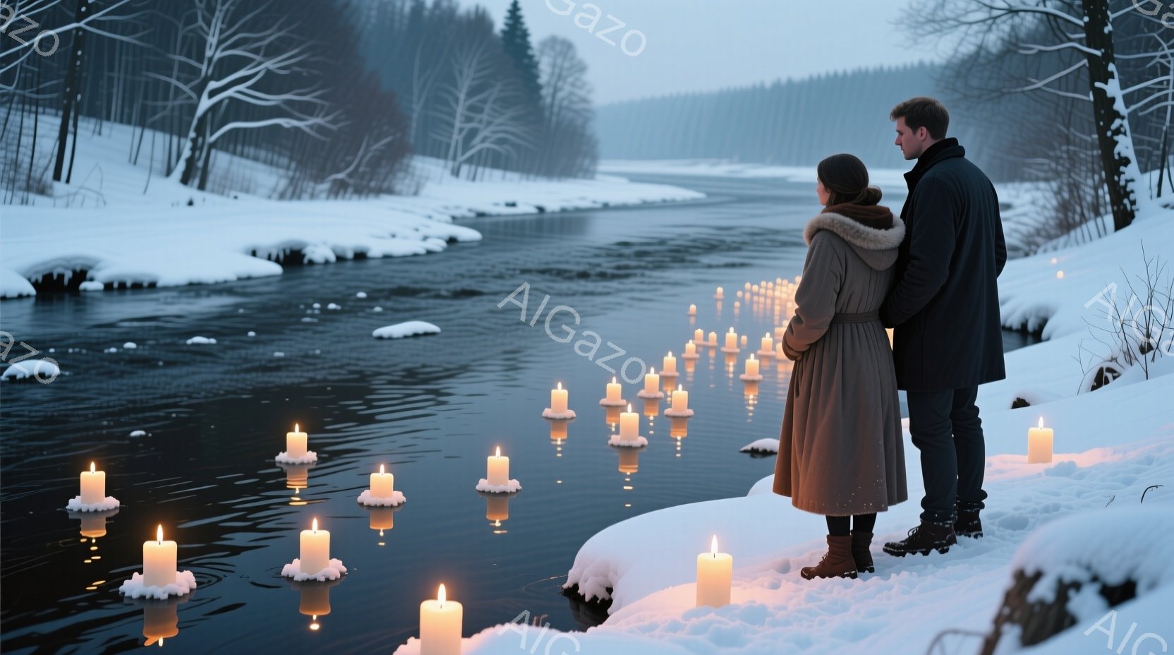 凍てつく川の上に無数のロウソクが灯されており、そのほとりに一対の男女が並んで座っている。女性は長い茶色の髪を肩まで垂らし、ベージュ色のコートのような上着を着て、横を向いて遠くを見つめている。男性は黒いパーカーを着ており、女性の隣で同じ方向を見つめており、全体的に静寂でロマンチックな雰囲気が漂っている。