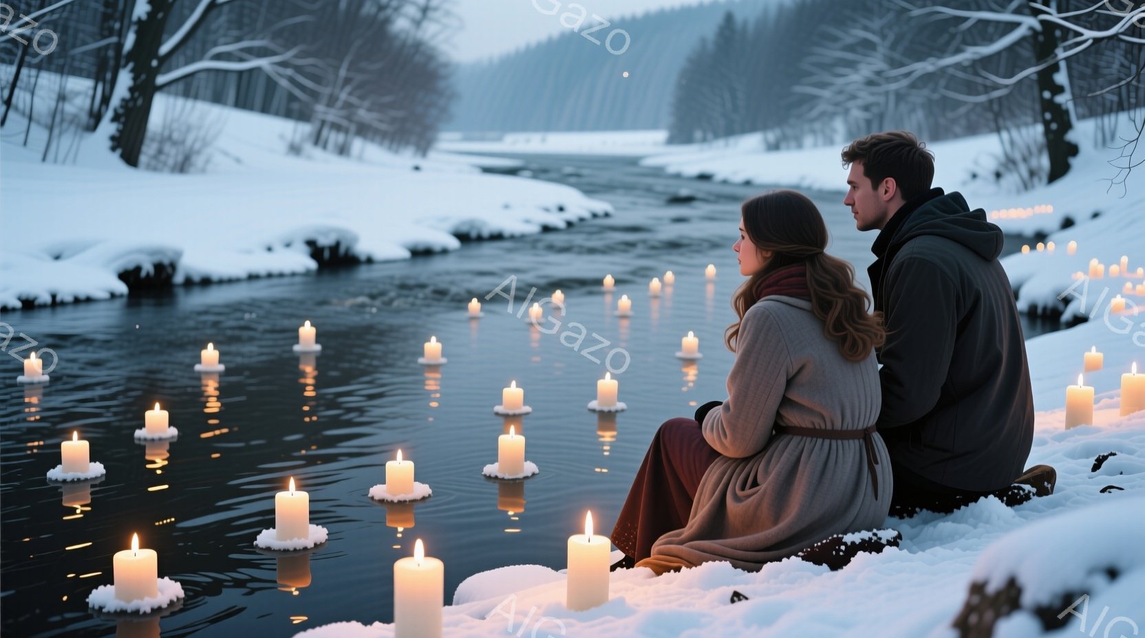 雪に覆われた川岸に、一対の男女が並んで立っている。女性は長いキャメル色のコートを着ており、髪は肩まで伸びており、後ろを向いて何かを見つめているようだ。男性は黒いコートを着ており、女性の隣で同じ方向を見つめ、周囲には水面に浮かぶ無数のロウソクが幻想的な光を放っている。