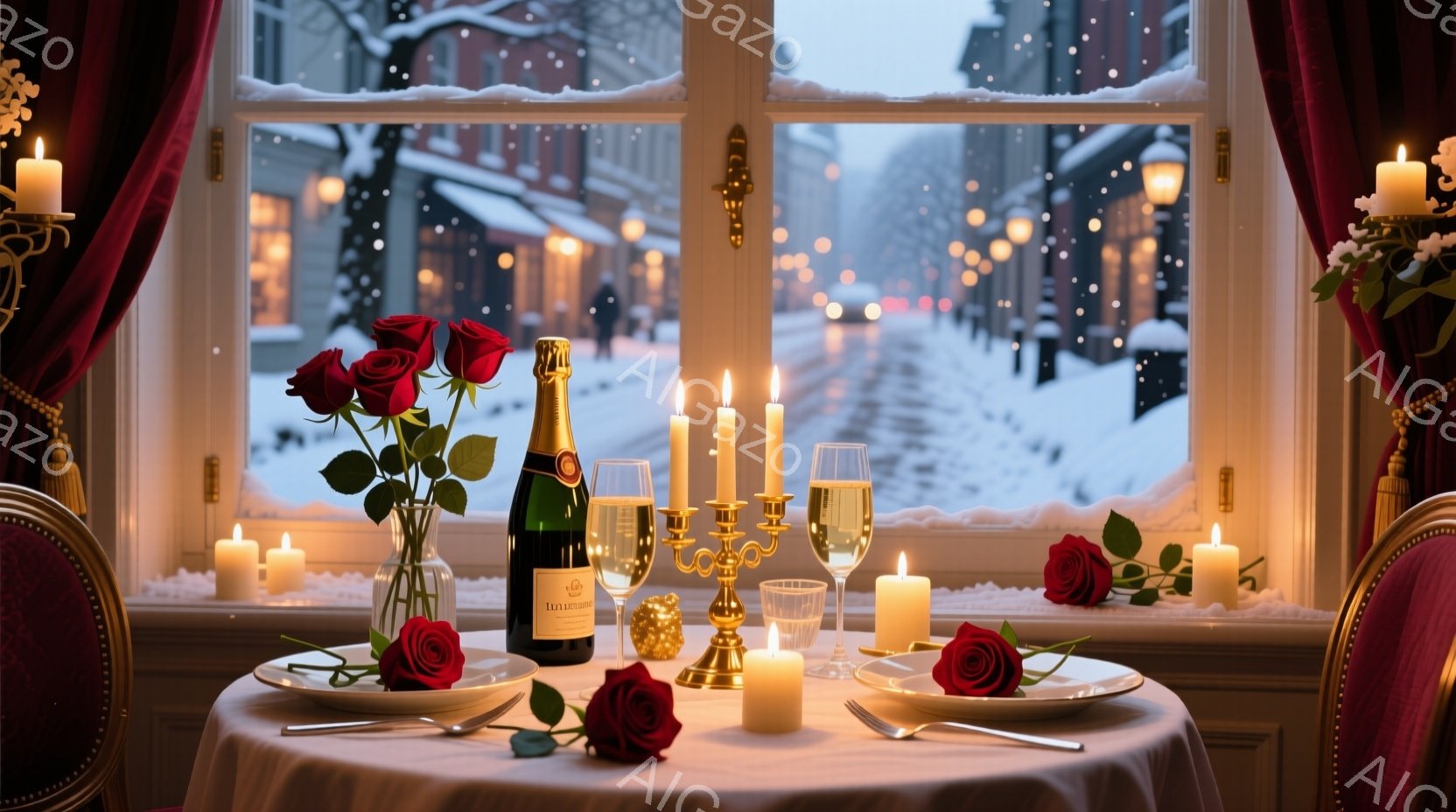 雪が降る窓の外を臨む、ロマンチックなディナーのテーブルが描かれています。白いテーブルクロスの上にシャンパンボトル、グラス、キャンドル、そして赤いバラが飾られ、特別な夜を演出しています。暖炉の光とキャンドルの炎が部屋を照らし、優雅で穏やかな雰囲気を醸し出しています。