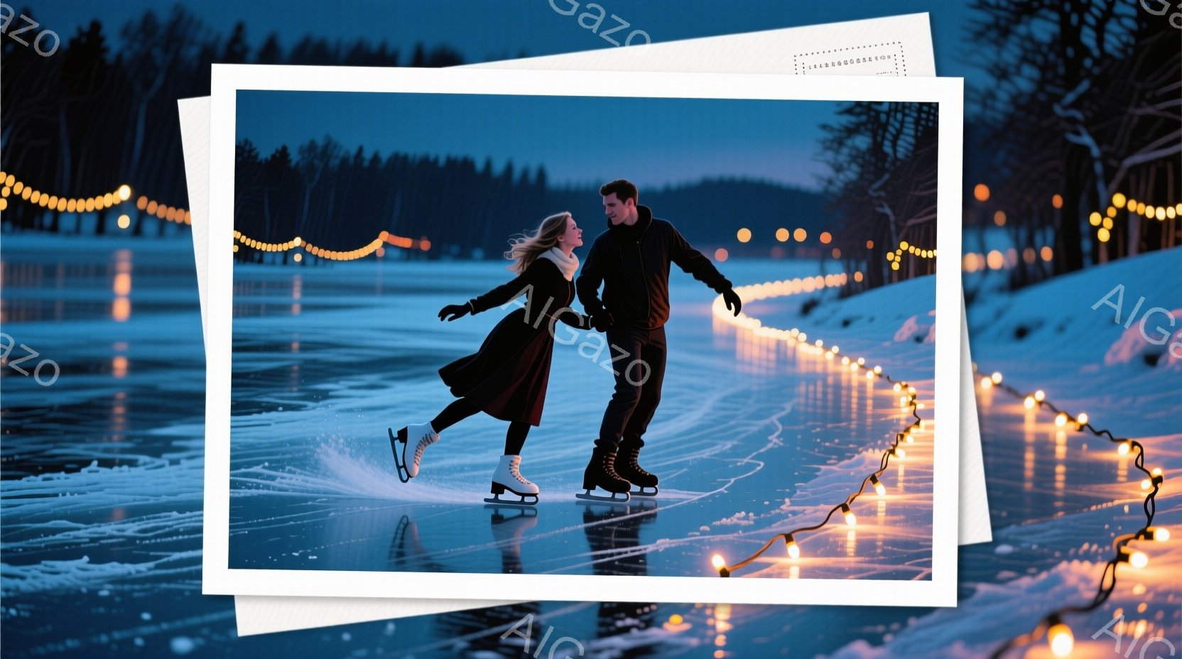 カップルが凍った湖の上でスケートを楽しんでいる様子が写っています。女性は白いコートと帽子を着用し、男性は黒いコートと帽子をかぶっています。背景には雪景色が広がり、湖の周りには温かい光を放つ電飾が並び、ロマンチックで穏やかな雰囲気を醸し出しています。