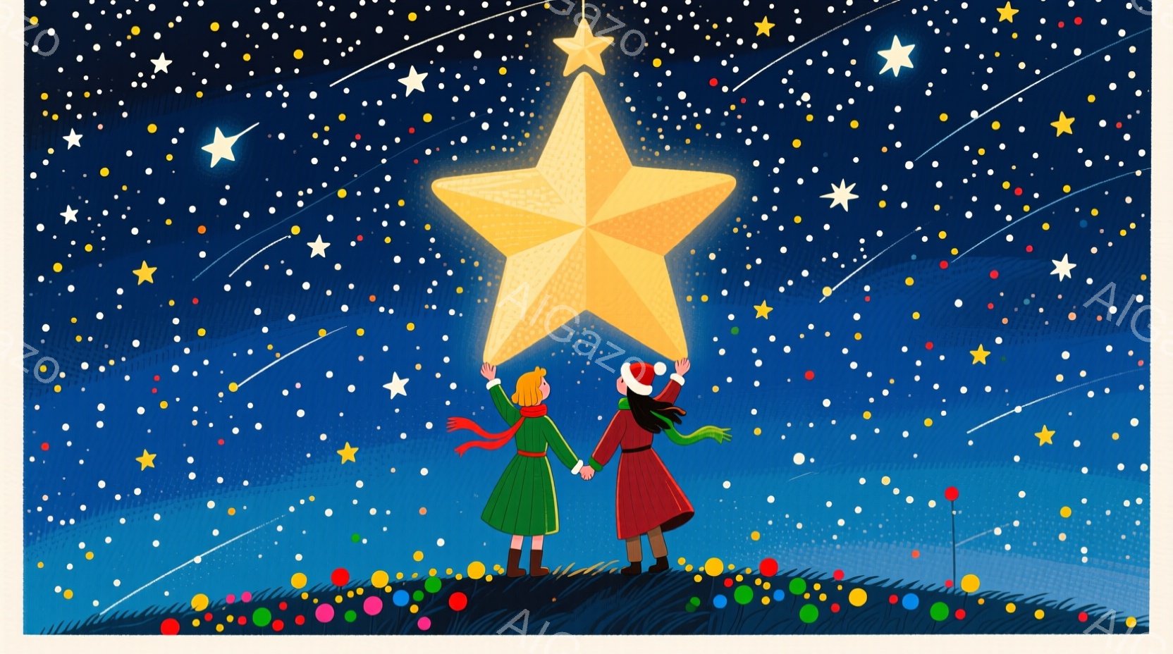 少年と少女が手をつないで星を見上げています。少年は紺色のセーターを着ており、少女は赤いワンピースを着ています。背景には無数の星が輝き、草原には色とりどりの小さな光が点在しており、ロマンチックで夢のような雰囲気が漂っています。