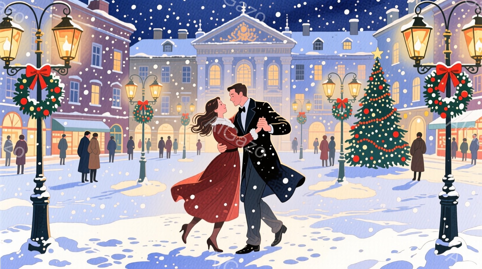 雪が舞う広場で、一対の男女が優雅にダンスを踊っている。女性は赤いロングドレスを身に着け、ゆるやかなウェーブの茶髪が肩から背中を流れている。背景には、クリスマスツリーやイルミネーションで飾られた建物が並び、暖かくロマンチックな雰囲気が漂っている。