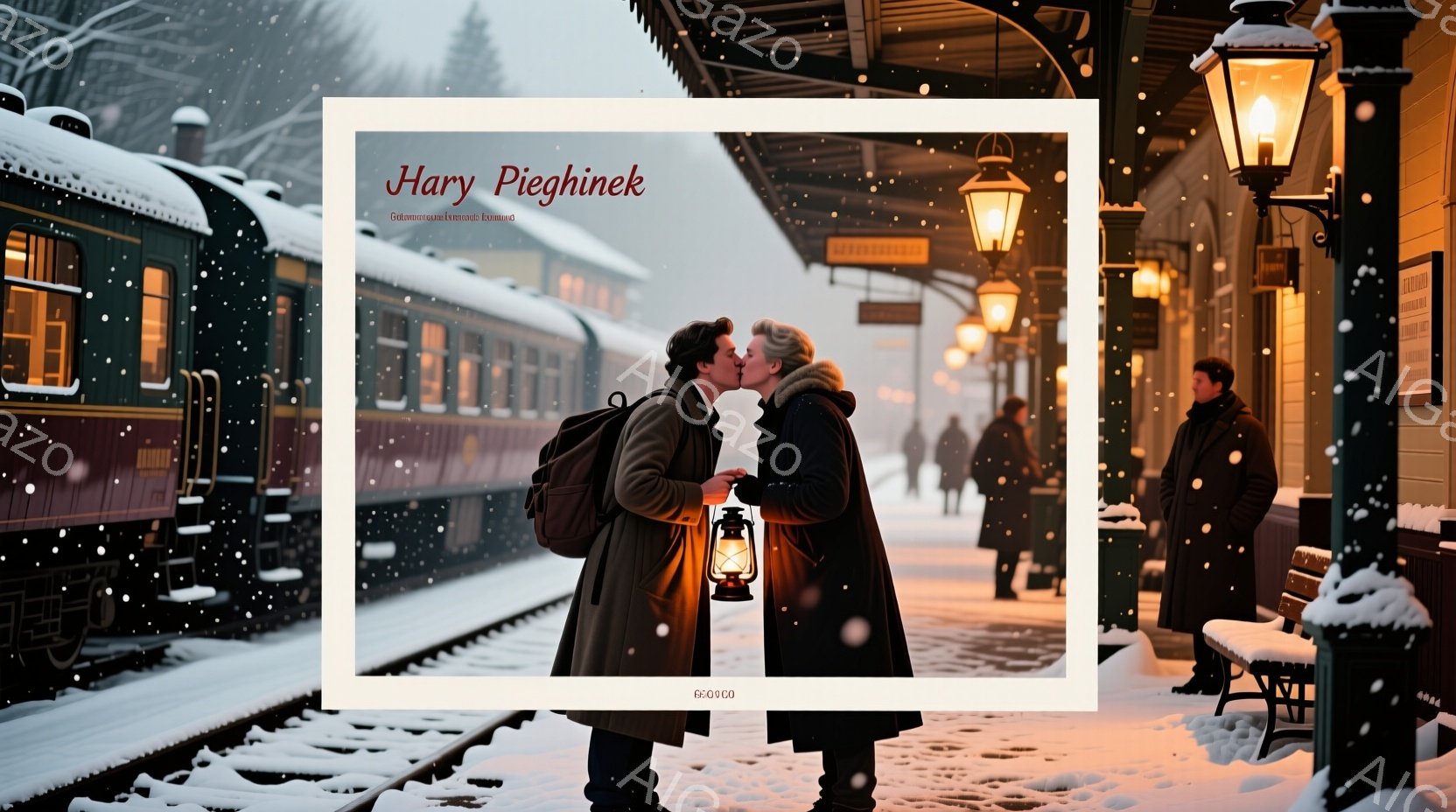 雪が降り積もるプラットフォームで、一対のカップルがキスをしています。女性は茶色のコート、黒いブーツ、赤い髪で、男性は黒いコートを着ています。背景には、蒸気機関車と、雪で覆われた古い駅舎が見え、温かくロマンチックな雰囲気が漂っています。