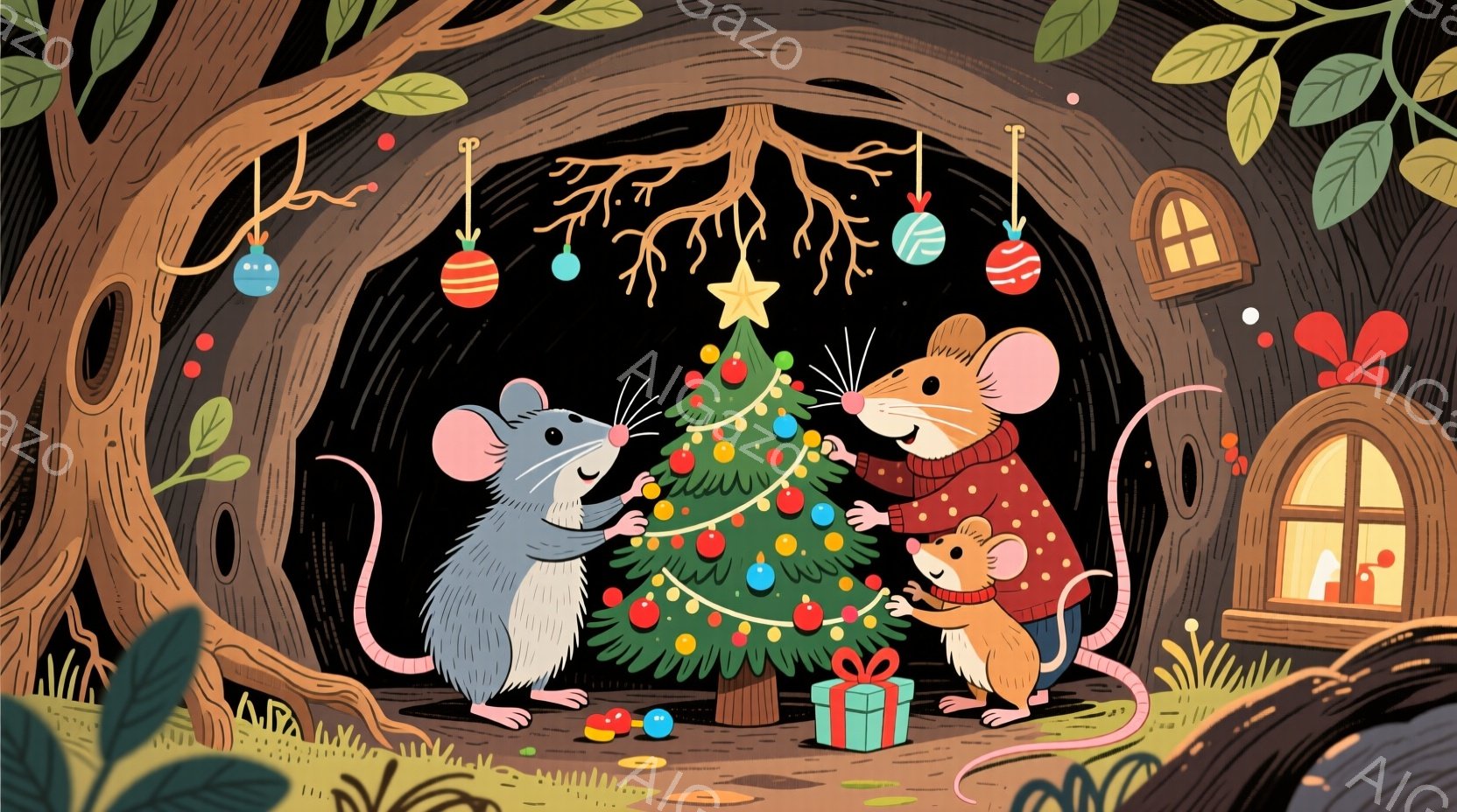 クリスマスの飾り付けをする3匹のネズミが描かれています。一番大きなネズミはエプロンを身に着け、クリスマスツリーにオーナメントを飾っており、他の2匹のネズミはツリーの下でプレゼントや飾り付けの準備をしているようです。背景には、木の根や可愛らしい家の窓が見え、暖かく楽しいクリスマスの雰囲気が漂っています。