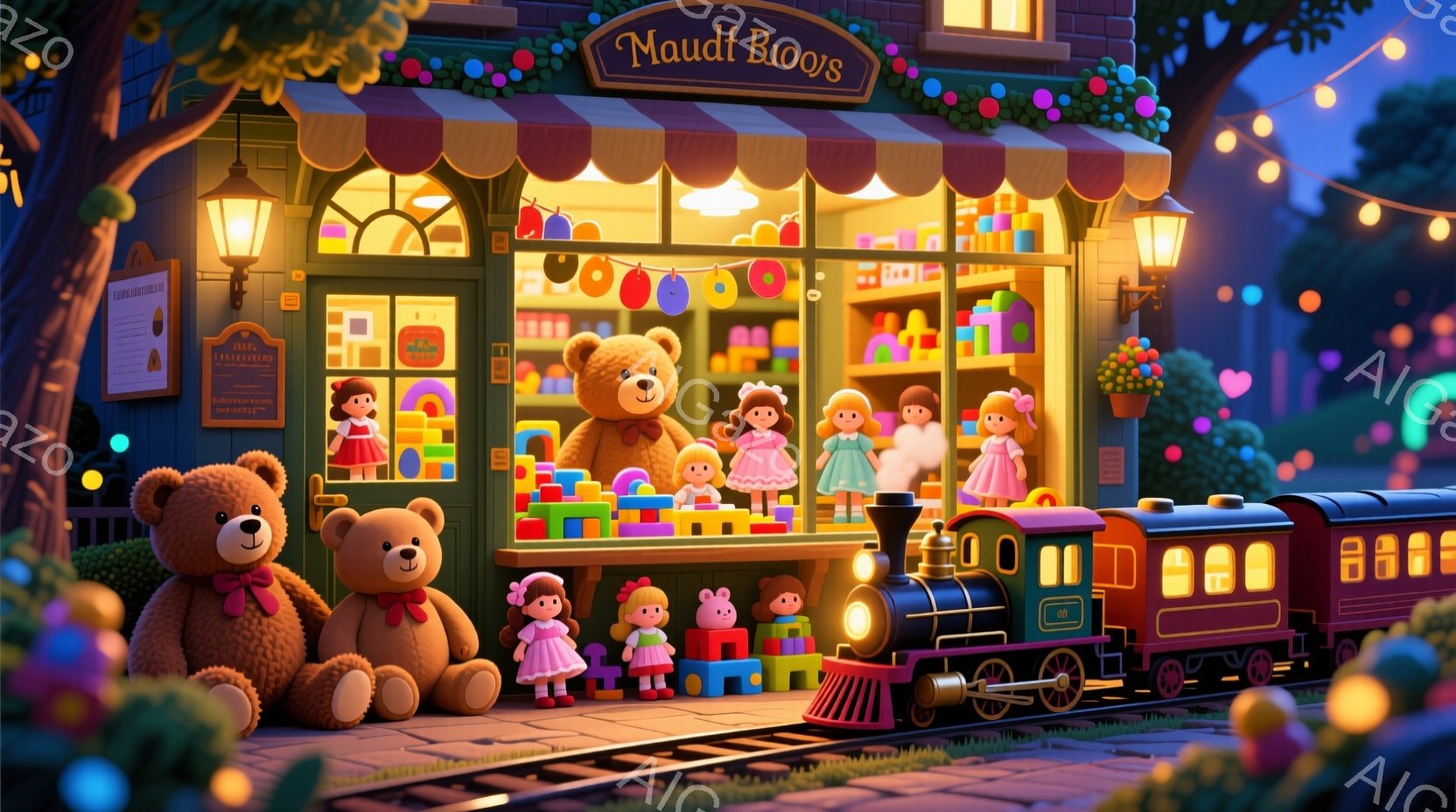 おもちゃ屋が賑やかに描かれており、正面には大きなテディベアが置かれ、店内には様々なぬいぐるみや木製のおもちゃが並んでいます。背景には蒸気機関車が線路の上を走っており、夜空には星空が広がり、おもちゃ屋の温かい光が周辺を照らしています。全体的に暖かく、夢のような雰囲気が漂っています。