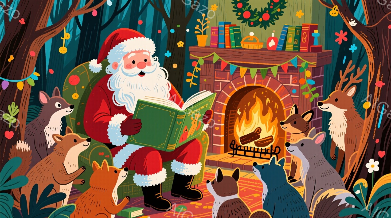 サンタクロースが暖炉の前で本を読み聞かせており、周りには様々な種類のキツネたちが興味津々に見入っています。サンタは赤い衣装に白い髭と髪を持ち、笑顔で本に集中しています。背景にはクリスマスツリーの飾りや本棚、暖炉の炎、そして緑豊かな自然が描かれ、温かく穏やかなクリスマスの雰囲気を醸し出しています。