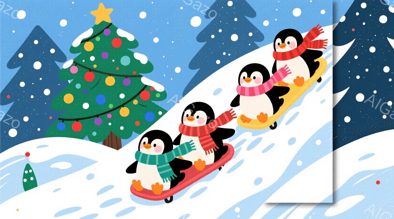 雪景色の中で、赤いスカーフを巻いたペンギンたちがソリに乗って楽しんでいます。ペンギンたちは笑顔で、それぞれ青色と赤色のソリに乗り、雪の斜面を滑り降りています。背景にはクリスマスツリーが飾られた建物と、雪に覆われた木々が点在し、冬の楽しい雰囲気を演出しています。