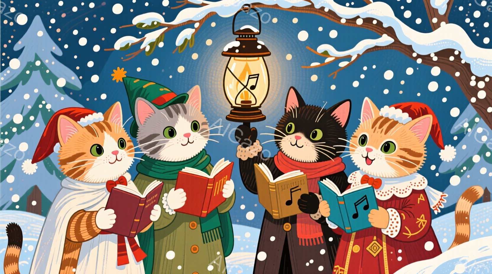 雪の中で歌う3匹の猫が描かれています。それぞれの猫は赤いサンタ帽をかぶり、マントと蝶ネクタイで装飾され、楽譜を開いて楽しそうに歌っています。背景には雪が降り積もり、木々が描かれ、上空には光を放つランタンが吊るされており、暖かく幻想的な冬の雰囲気を醸し出しています。