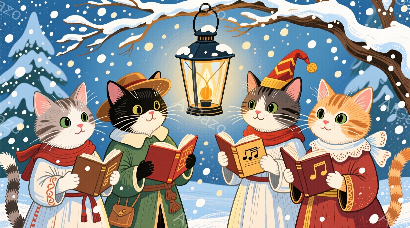 4匹の猫が冬の夜に集まり、歌を歌っているイラストです。それぞれ赤いサンタ帽や緑の帽子をかぶり、暖かな緑や茶色のコートを着ています。背景には雪が舞い、木々がシルエットとなって冬の夜の静かで穏やかな雰囲気を醸し出しています。
