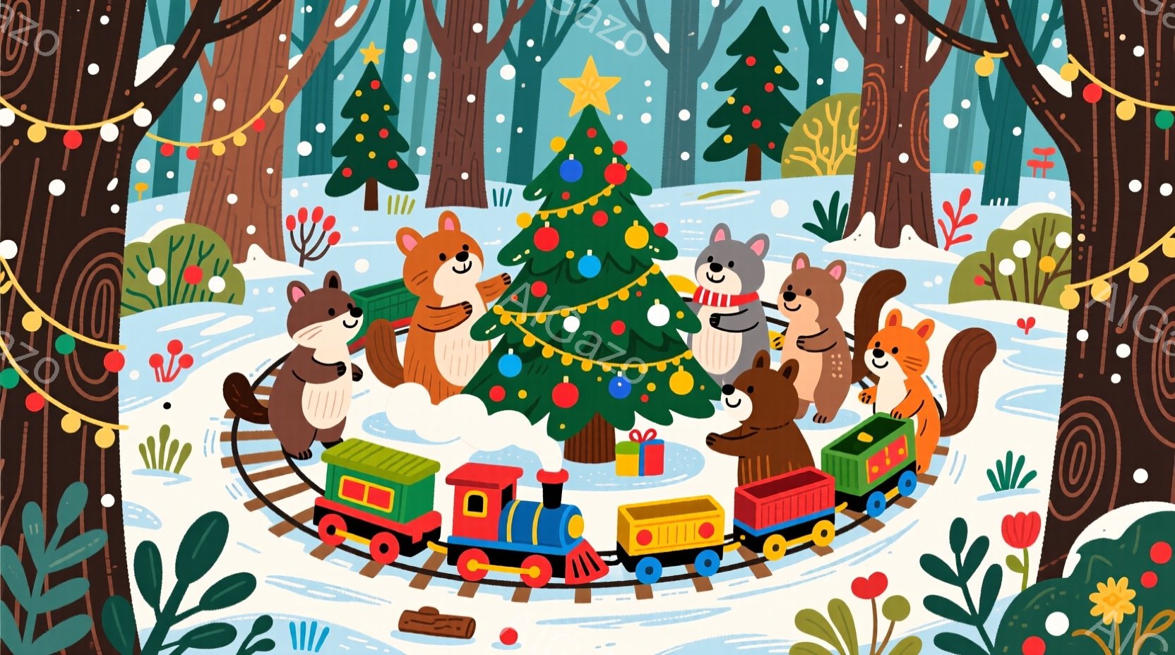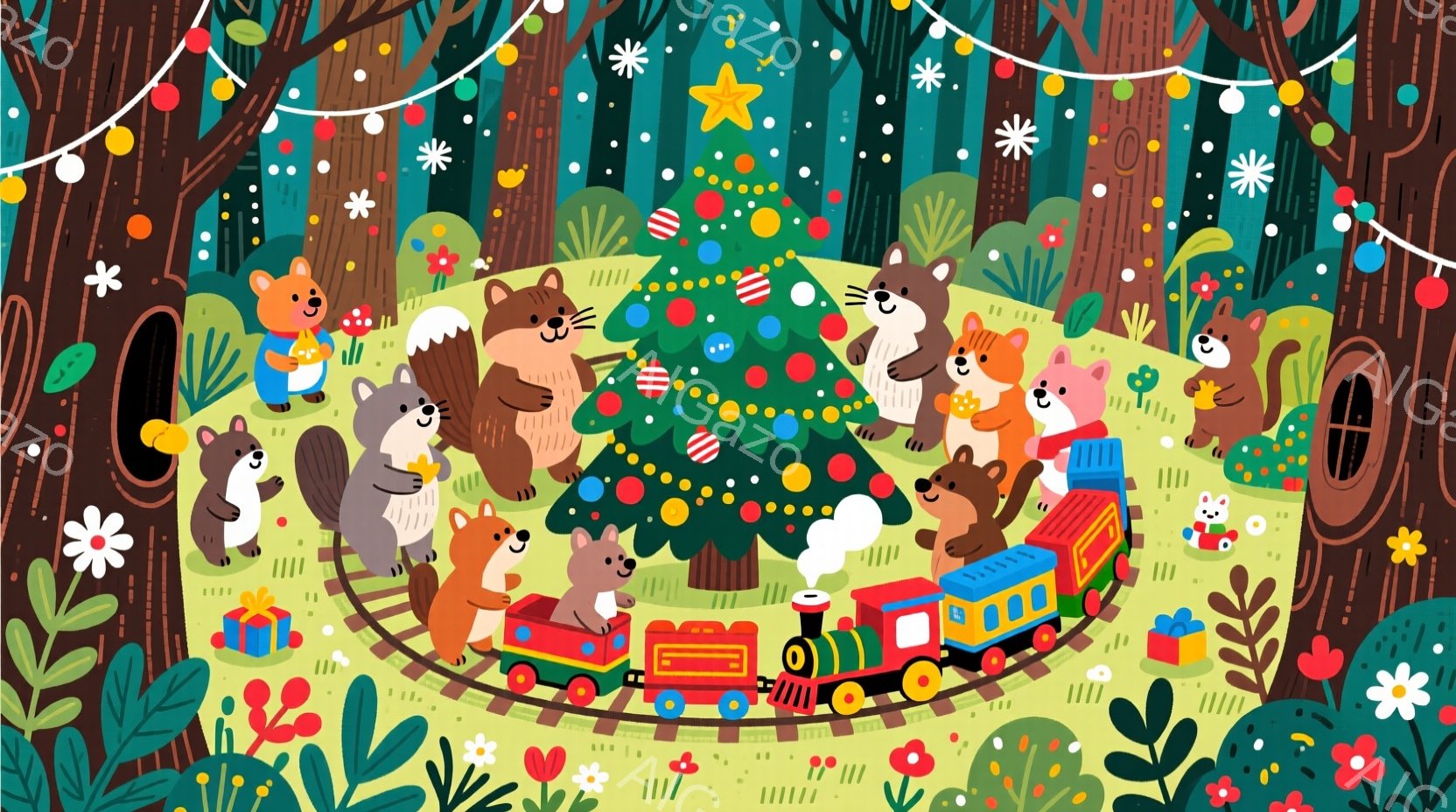 カラフルなイラストには、クリスマスのツリーを背景に、動物たちが列車に乗っている様子が描かれています。それぞれの動物は笑顔で、楽しそうな表情をしています。背景には緑豊かな植物やギフトボックスが配置され、暖かく、お祝いの雰囲気です。