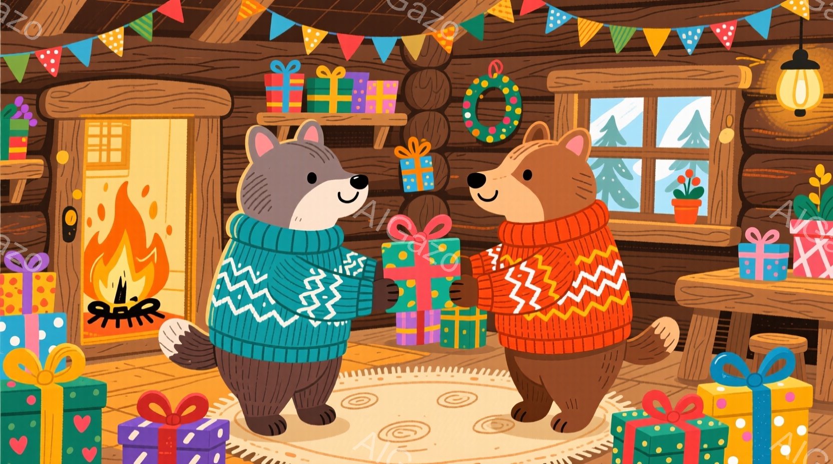 暖かい室内で、2匹のクマがプレゼントを抱えています。片方のクマは青いセーターを着ており、もう片方は赤いセーターを着ています。背景には、プレゼントがたくさん並び、窓から雪景色が見え、クリスマスの飾り付けが施された、お祝いムードにあふれた空間です。