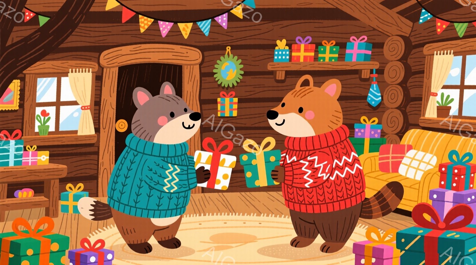 温かい室内には、クリスマスのプレゼントがたくさん置かれ、暖炉の火が暖かく灯っています。緑色のセーターを着た狼と、オレンジ色のセーターを着たクマが、プレゼントを交換するように向き合い、穏やかな笑顔を浮かべています。木製の壁と床、クリスマスデコレーションが暖かく、ホリデーシーズンらしい心地よい雰囲気を作り出しています。