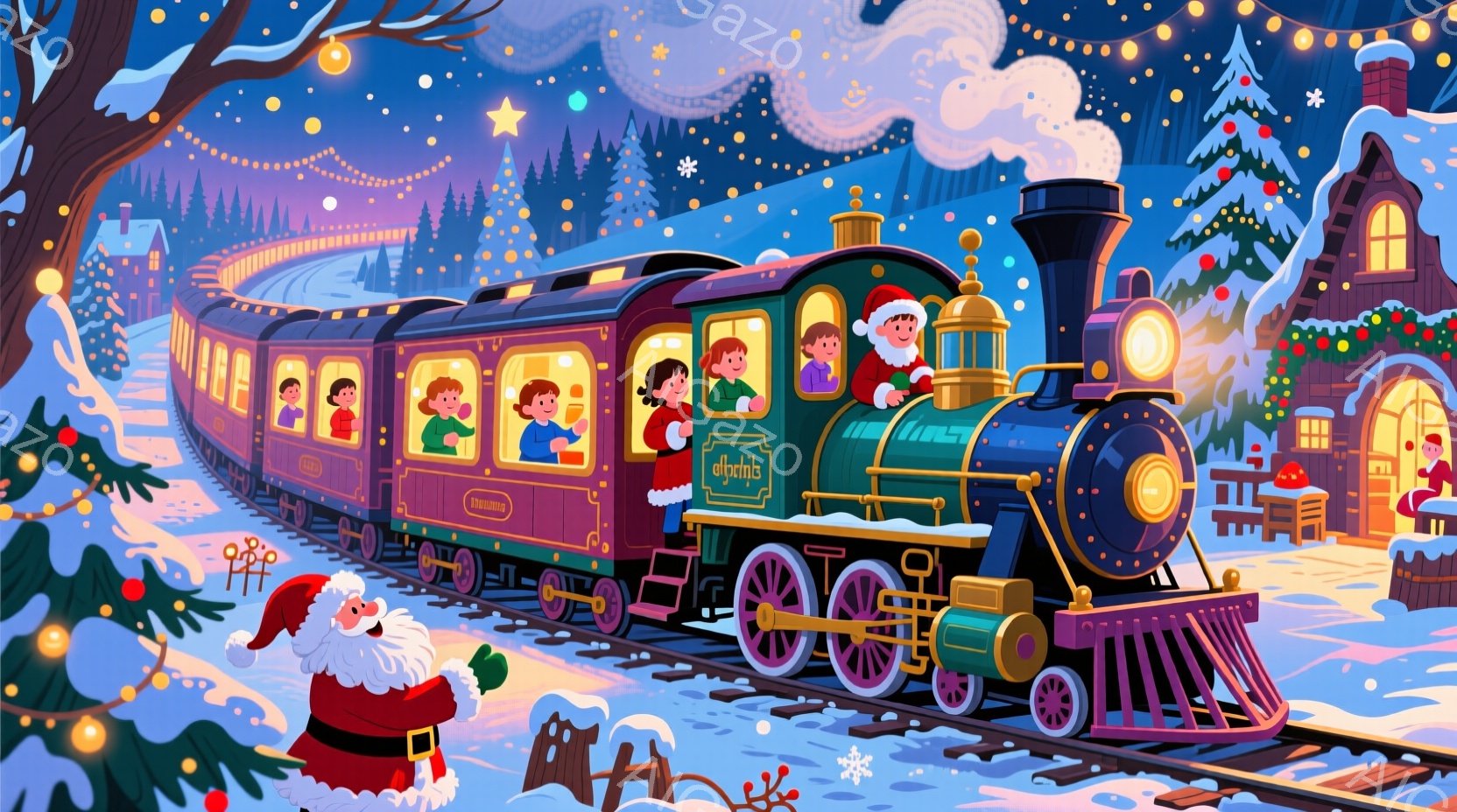 明るい緑色の機関車が雪景色の中を走っており、機関士は赤い帽子をかぶって笑顔で運転しています。車内には、様々な髪型と服装をした子供たちが喜びの表情を浮かべており、クリスマスのプレゼントが積まれた雪の風景が広がっています。背景には、光り輝く家々や雪に覆われた木々が描かれ、暖かく幸せなクリスマスの雰囲気を醸し出しています。