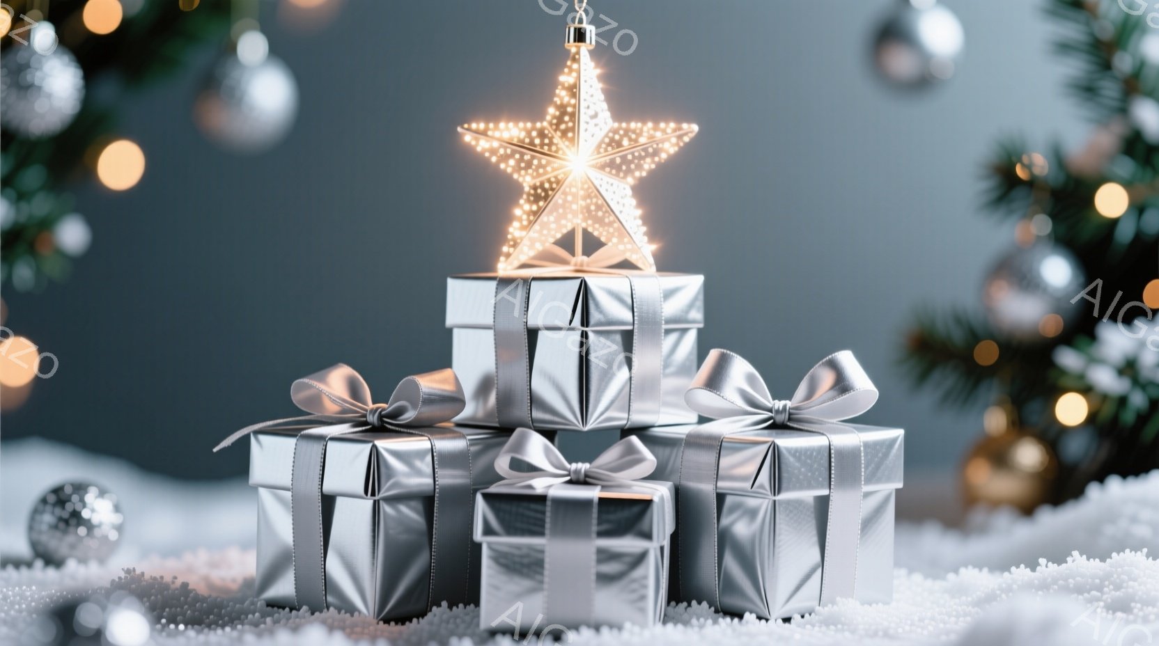 輝く銀色のプレゼントの山が雪の上に積み重なっています。一番上には光り輝く星形のオブジェが飾られ、周りには装飾されたクリスマスツリーと雪の結晶が舞う幻想的な冬景色が広がっています。全体的に、きらびやかで温かみのある、ホリデーシーズンの喜びを表現したイメージです。