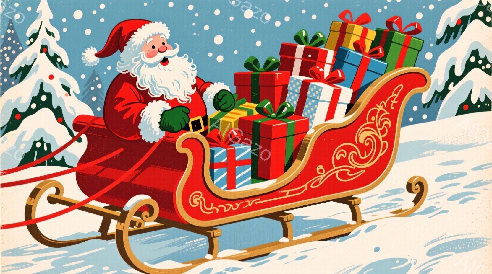赤い衣装を着たサンタクロースが、プレゼントの山を積んだ赤いソリを操縦している様子が描かれている。彼は白いひげを生やし、楽しそうな表情で手綱を握っている。背景には雪景色が広がり、遠くには雪をまとった木々が見え、全体的に暖かく、お祝いの雰囲気が漂っている。