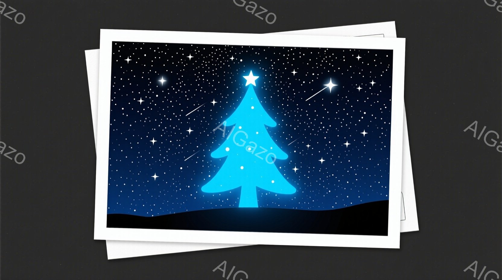 深い藍色の夜空に、明るい水色のシルエットのクリスマスツリーが浮かび上がっています。ツリーの足元には暗い山の稜線が広がり、星が瞬く夜空が幻想的な雰囲気を醸し出しています。全体的に静かで神秘的、そして温かい気持ちになるようなイメージです。