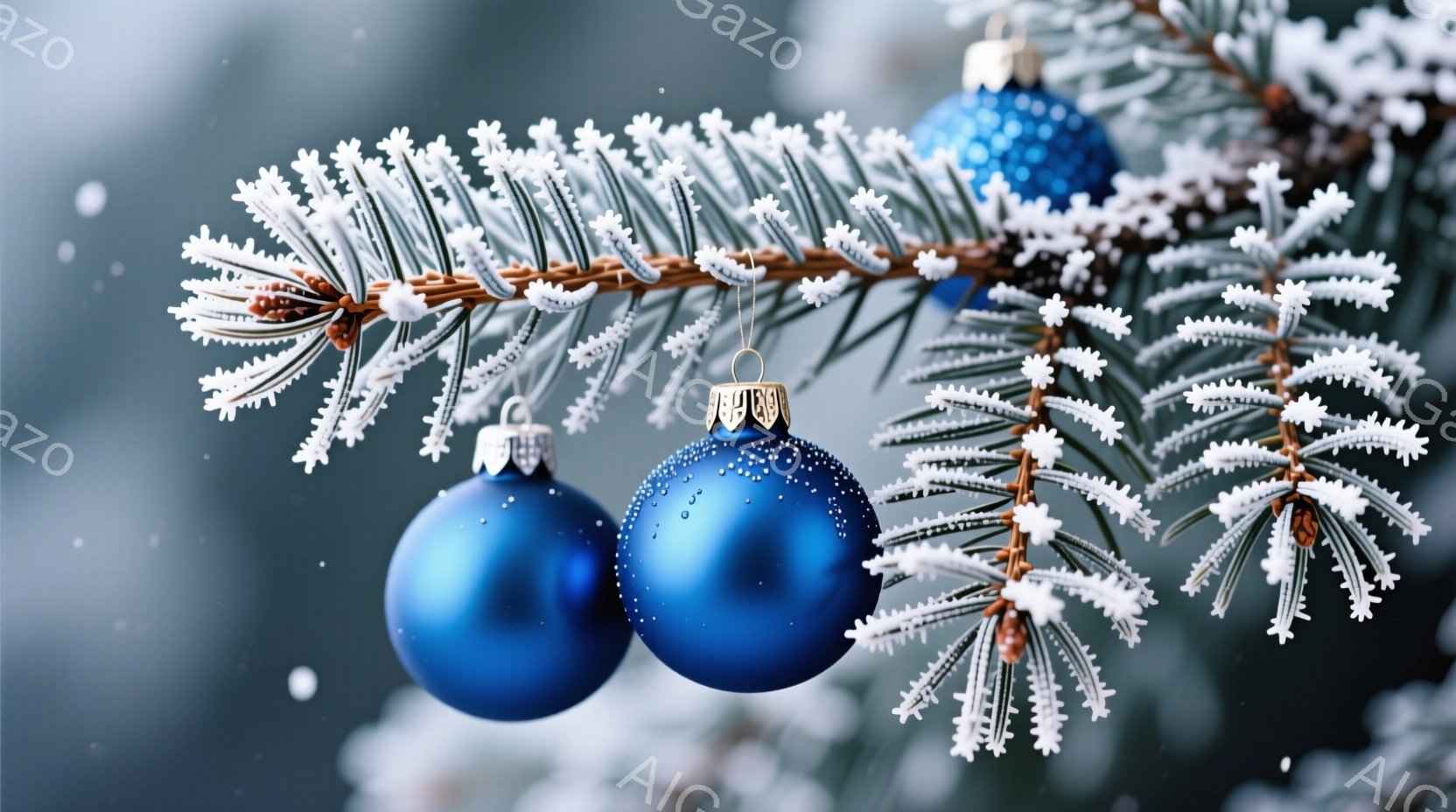 雪で覆われたモミの木の枝に飾られた三つの青いクリスマスオーナメントを描いています。オーナメントはそれぞれ異なる模様を持ち、光沢があり、冬の静寂と輝きを表現しています。背景はぼやけており、雪が舞う冬の風景を暗示しています。