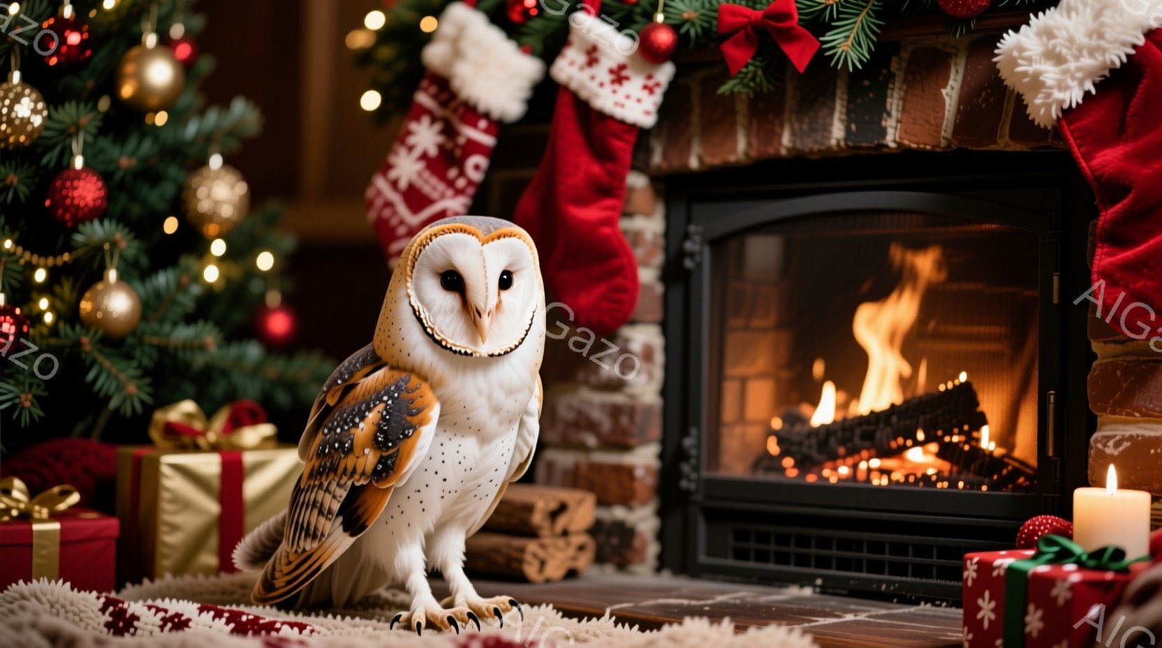 白い顔と胸元、茶色い羽を持つメンフクロウが、クリスマスツリーの近くの敷物の上に立っている。暖炉の火が暖かく光り、赤いクリスマスストッキングが暖炉の上に掛けられており、プレゼントが周囲に置かれている。全体的に、暖かく居心地の良い、お祝いのクリスマスの雰囲気が漂っている。