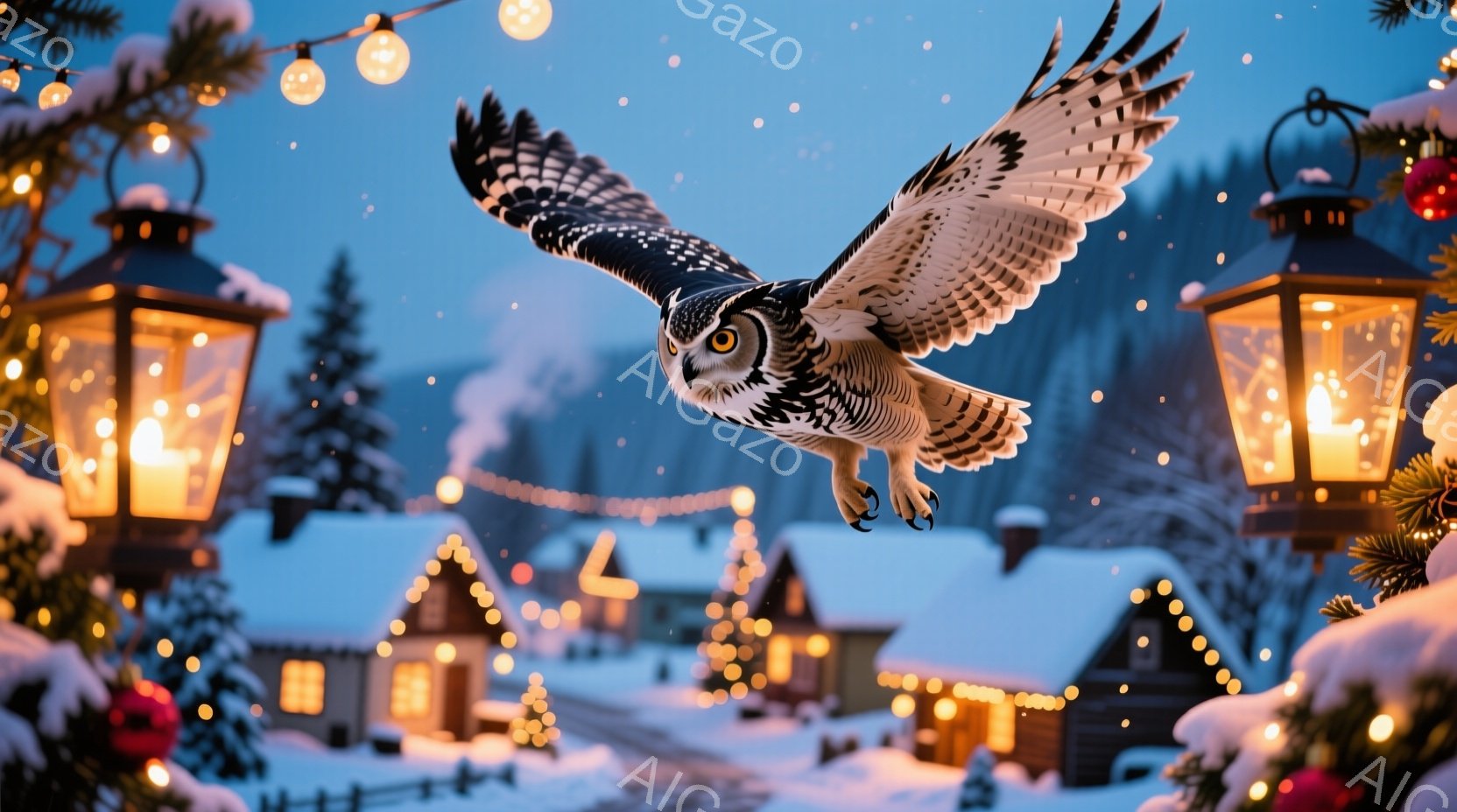 雪景色の中に、翼を広げた大きなフクロウが舞っている。背景には、クリスマスライトで飾られた可愛らしい家々が並び、雪に覆われた森が広がっている。暖かく幻想的な雰囲気で、冬の夜の静けさと魔法のような瞬間を捉えている。
