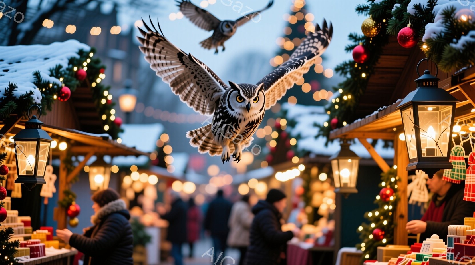 賑やかなクリスマスマーケットを背景に、翼を広げた猛禽類が飛び交っている様子が捉えられています。人々は冬の厚着を身に着け、マーケットの屋台を歩き回っており、温かい光が灯された装飾が冬の夜を照らしています。雪が降る中、活気があり、お祭り気分に満ちた光景で、背景には木々が見え、冬の寒さを感じさせます。
