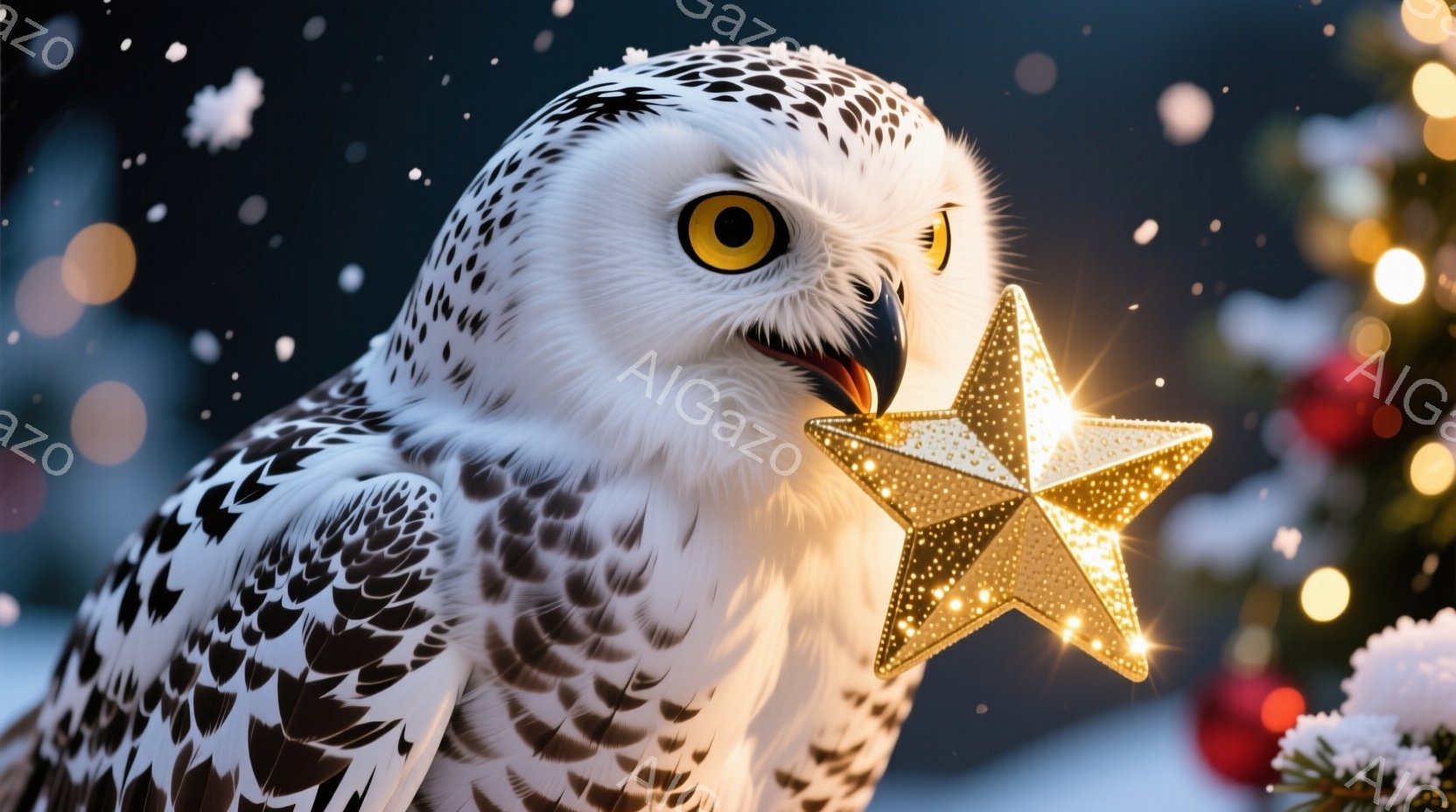 白いフクロウが金色に輝く星をくちばしで優しく挟んでいます。背景にはクリスマスの飾り付けが施された木があり、ぼんやりとした光が暖かく穏やかな雰囲気を醸し出しています。雪が舞い散る冬の夜を思わせる、幻想的で可愛らしい光景です。