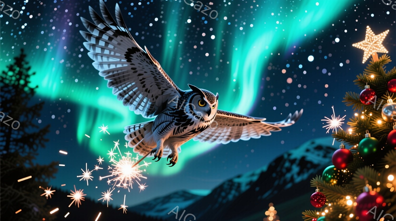 白いフクロウが、緑と紫のオーロラと雪の降る冬の風景の中で飛んでいる様子が描かれています。背景には、クリスマスツリーの飾りと、点在する光の粒子があり、幻想的な雰囲気を醸し出しています。フクロウは翼を広げ、力強く空を舞い、冬の夜空に希望の光を添えています。