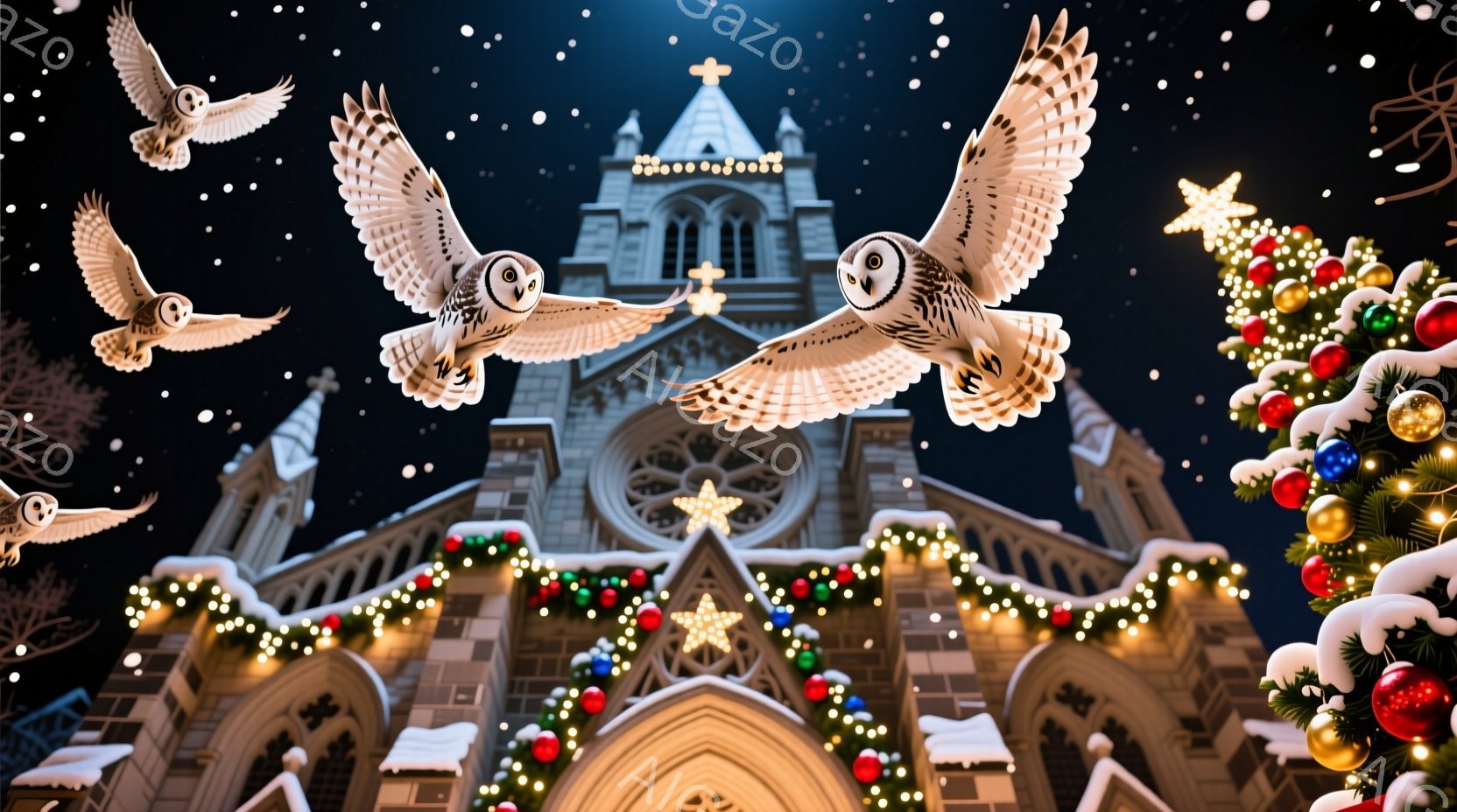 ゴシック様式の大きな教会が背景にあり、クリスマスデコレーションで華やかに飾られています。複数の猛禽類、おそらくフクロウが教会とクリスマスの飾りを背景に飛び交っており、冬の空の下、幻想的な雰囲気を醸し出しています。教会の周りには雪が積もり、全体的に静かで穏やかな、クリスマスの祝祭の雰囲気を伝えています。