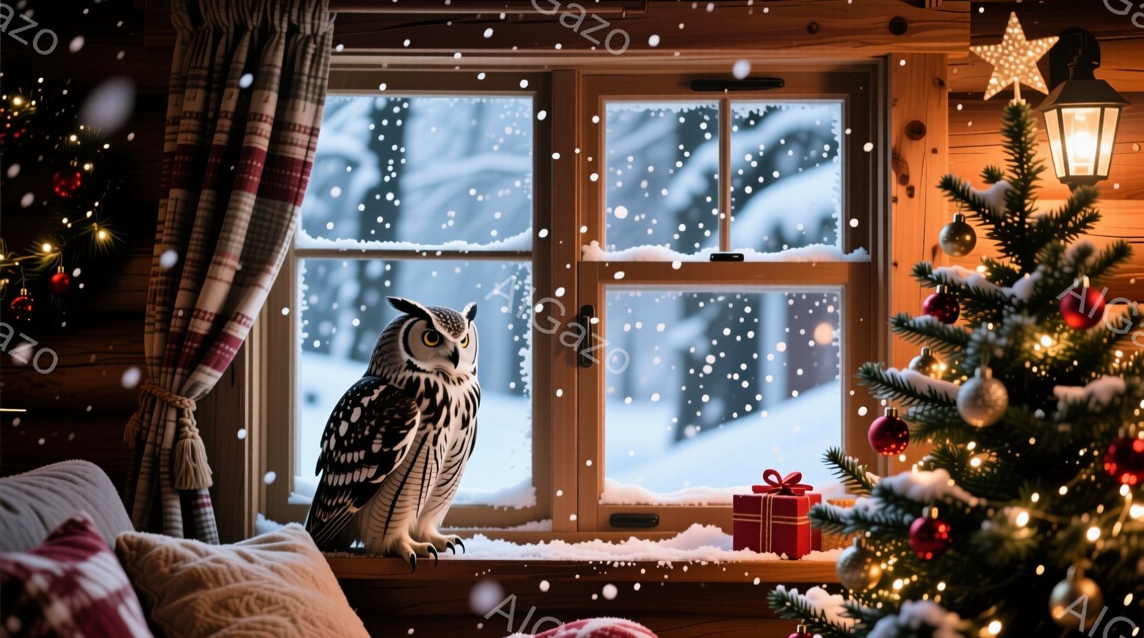 窓辺に白いフクロウが座り、外の雪景色を眺めている。室内は木の温もりが感じられるキャビンで、クリスマスツリーやプレゼントが置かれ、暖炉の光が優しく照らしている。雪が舞い散る冬の夜の、静かで温かい雰囲気が漂っている。