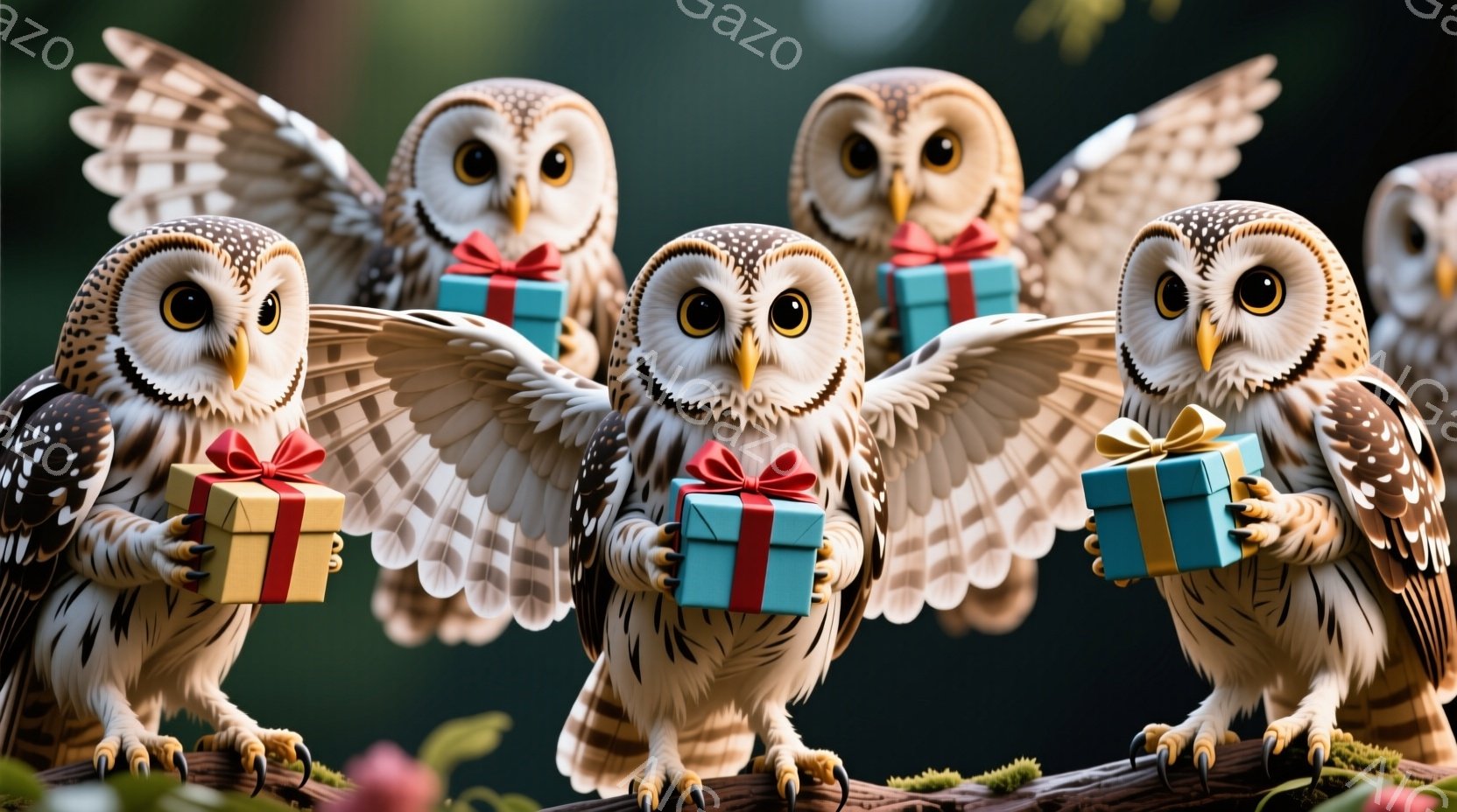 プレゼントの箱を抱えた四羽のフクロウが写っています。フクロウたちは翼を広げ、自信に満ちた表情でカメラを見つめており、背景にはぼやけた緑色の自然が見えます。全体的に、お祝いや喜びを表現する、暖かく魅力的な雰囲気です。
