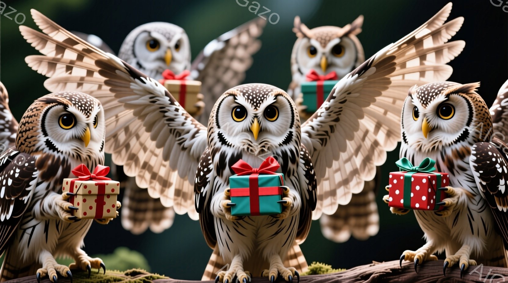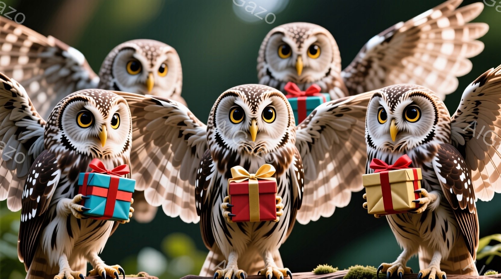 プレゼントの箱を抱えたフクロウが3羽、木の枝の上に並んでいます。中央のフクロウは翼を広げ、他の2羽はプレゼントを抱えながら正面を見ています。背景は緑豊かな自然で、落ち着いた暖かな雰囲気を醸し出しています。